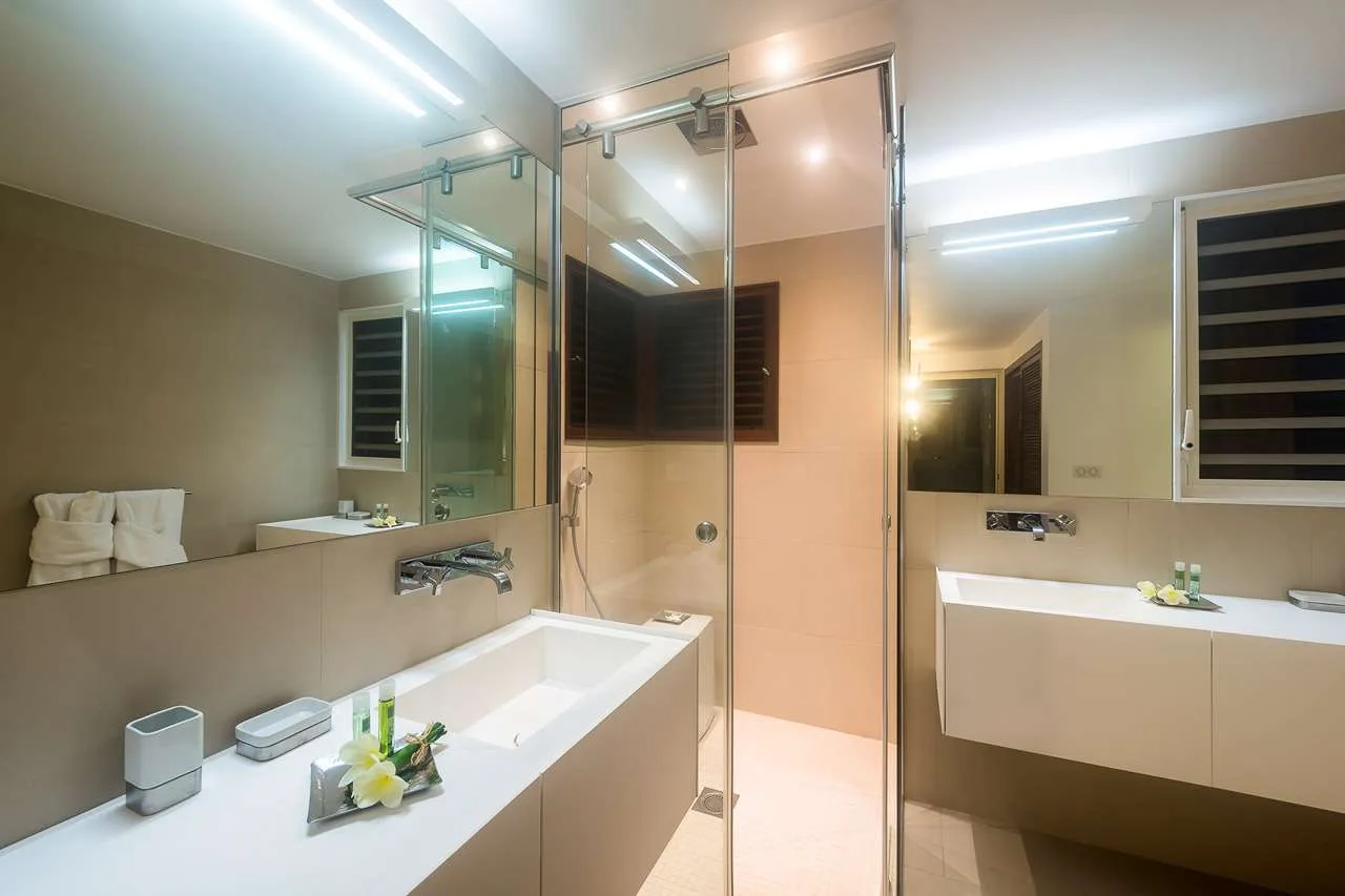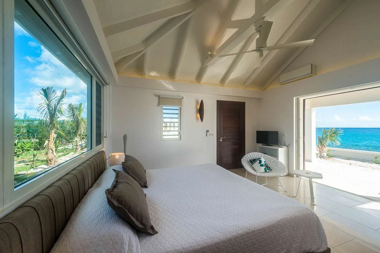 Each bedroom has a king-size bed, TV with Netflix access, ocean views, and an ensuite bathroom with shower. The master bedroom connects from the interior to the main living area. One bedroom is only accessible from outside.