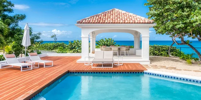 Beautiful Villa La Riviera (Villa Code: SXM DAY) is a fabulous 5+1 bedroom St. Martin villa rental located on sublime Plum Bay Beach, with its beautiful sunsets and crystal clear water. The villa has a delightful outdoor terrace with large pool and poolside gazebo overlooking the beach and your very own tennis court on the beach! The spacious living and dining area and large adjoining gourmet kitchen open out to the terrace and enjoy the beautiful ocean view.