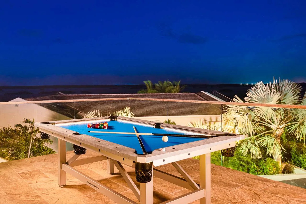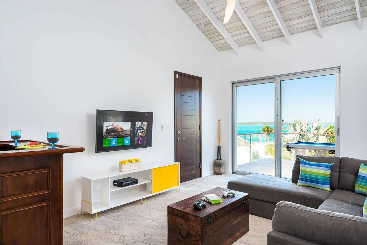 The living room has a large sectional sofa and a large flat-screen monitor with standard cable television. You can also sink in and listen to music on the villa’s interior and exterior sound system, available to use with a free smartphone app. For night’s inside, there’s also a game room set up in the annex above the garage.