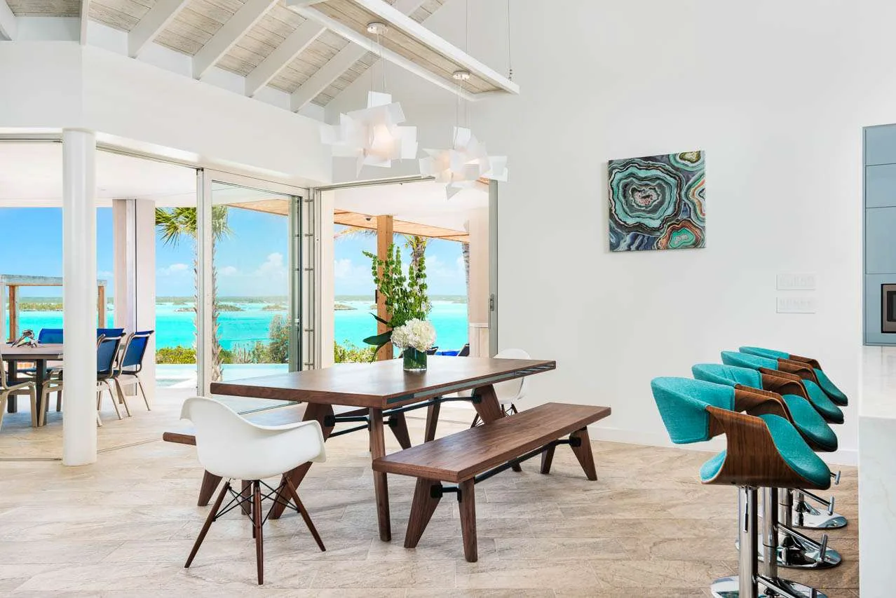A dining table between the living room and kitchen is a great spot to come together with friends and family over a meal. A table on the pool terrace is ideal for dining under the stars, pairing your meal with the gentle sounds of the water lapping at the nearby shore.