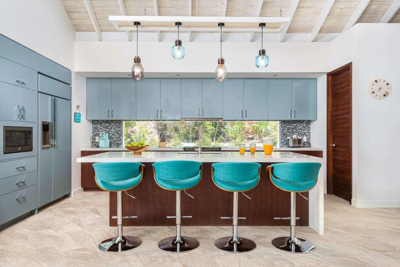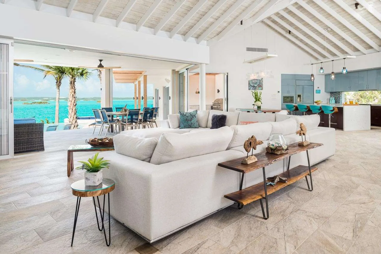 The great room at Villa Alinna combines the living room, dining area, and kitchen, all opening to the outdoor terrace. With the windows open the space is bright and breezy, with the fresh ocean air enticing you to kick back and enjoy the tranquillity of Caribbean life.