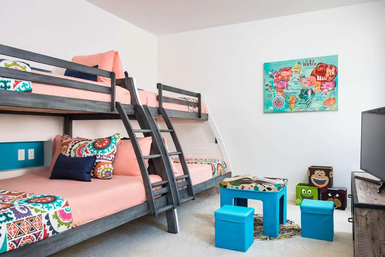 The fifth bedroom is set up as a kids’ room, with two bunk-style beds – a queen on the bottom and twin on top. This room also comes with an ensuite bathroom. All rooms also come with a TV. Upon prior request and approval, the annex can be converted into an additional suite with its ensuite bathroom and ocean views.