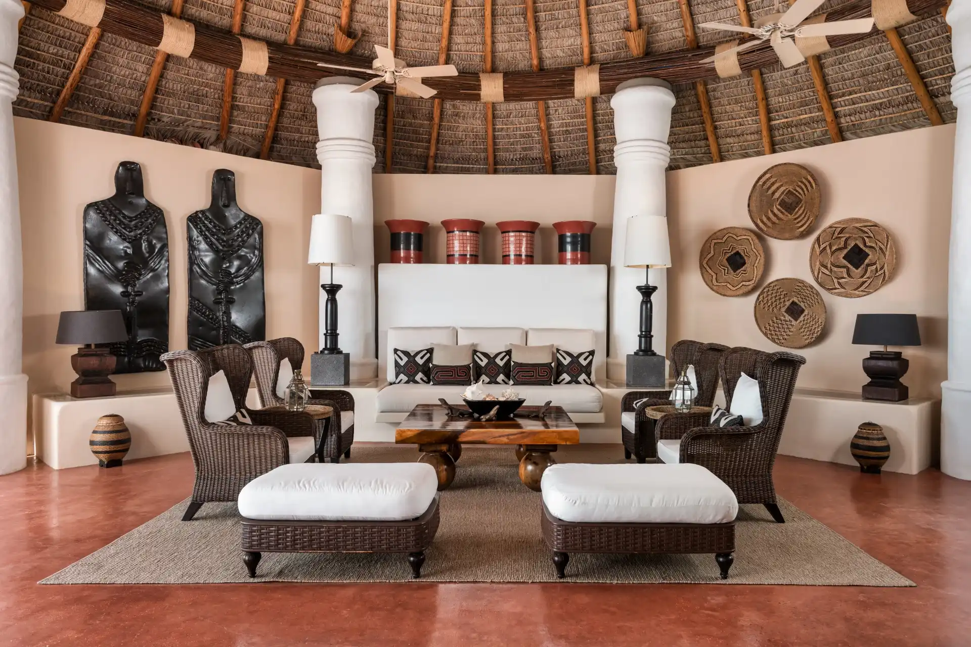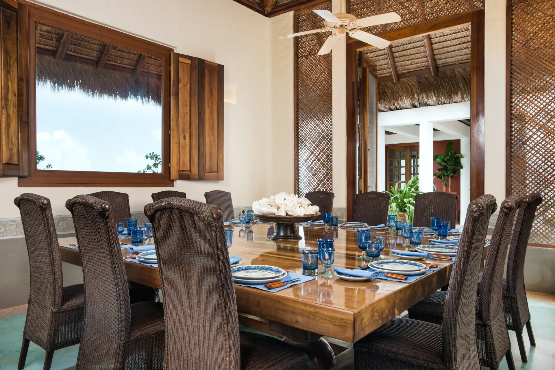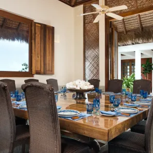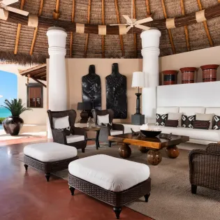 The main living room features a beautiful mix of island-style antiques and luxurious furnishings. Above, ceiling fans hang down from a thatched, vaulted roof, while the entire space opens completely to the outdoor terrace. This is the definition of island luxury.