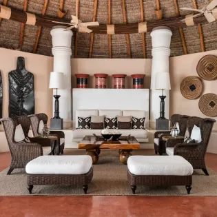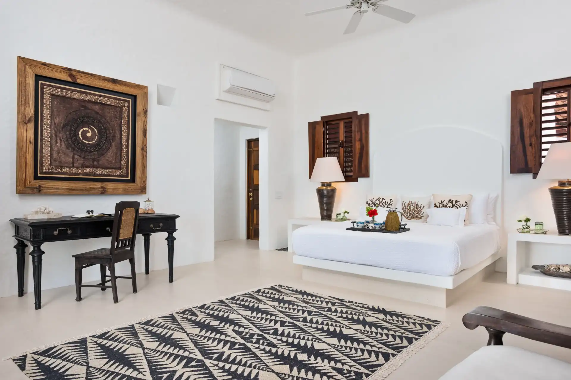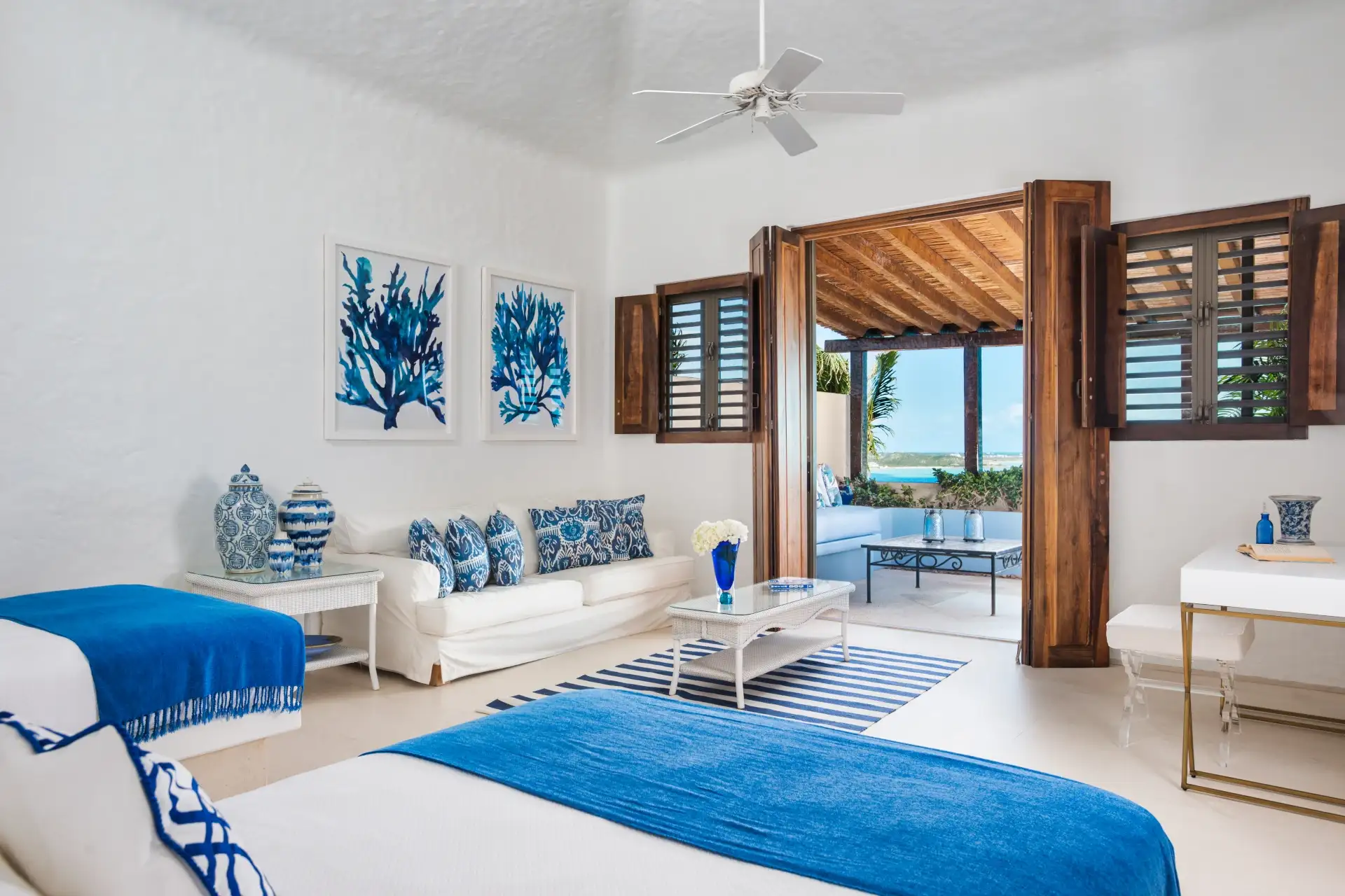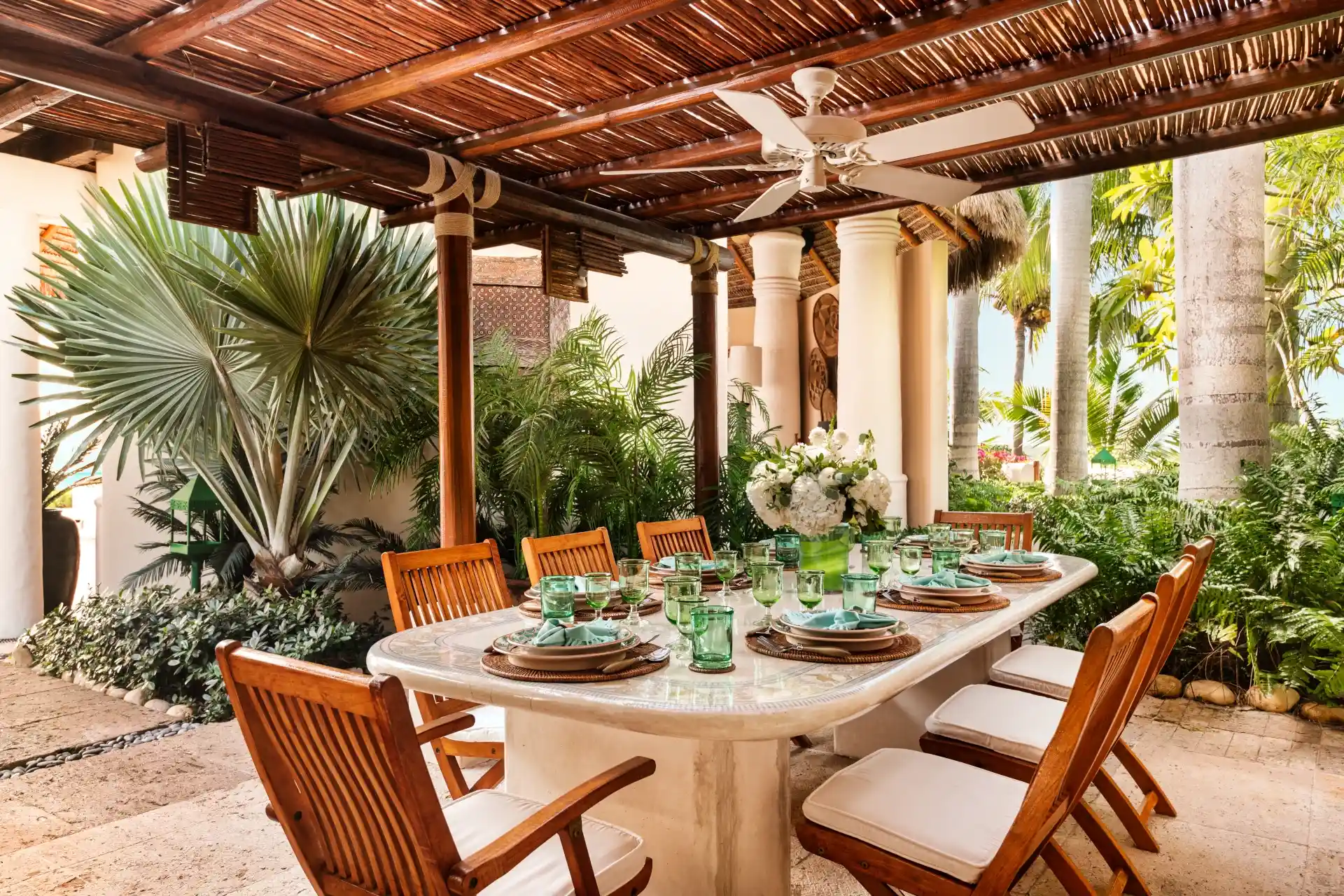 The main living room features a beautiful mix of island-style antiques and luxurious furnishings. Above, ceiling fans hang down from a thatched, vaulted roof, while the entire space opens completely to the outdoor terrace. This is the definition of island luxury.