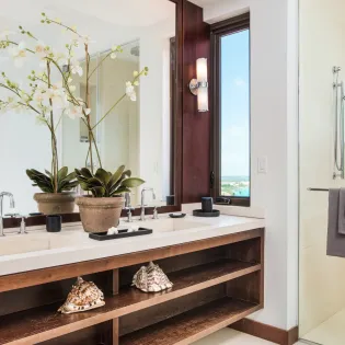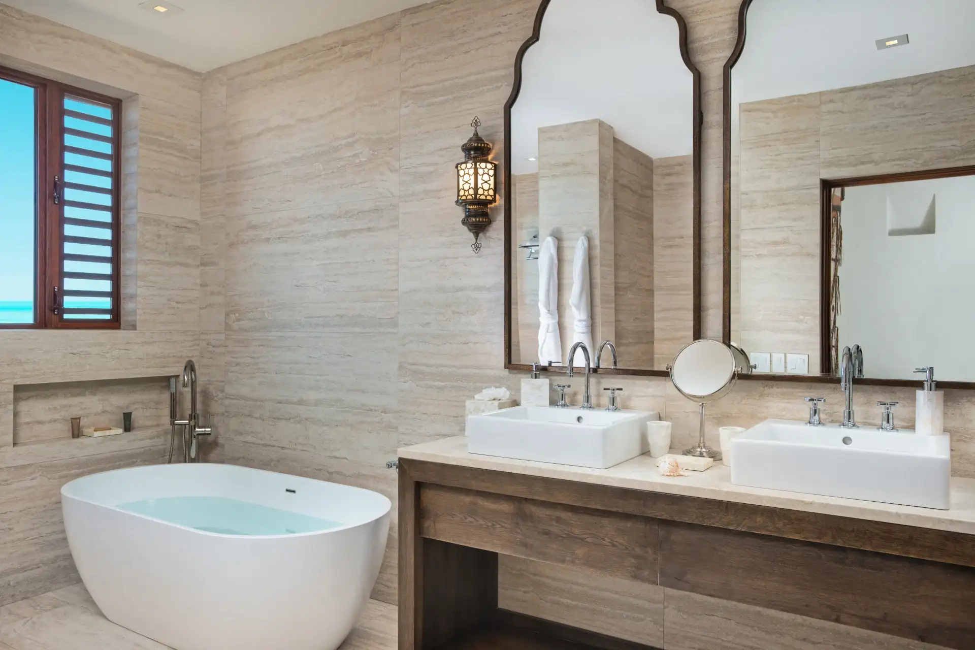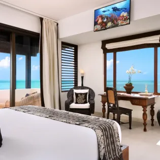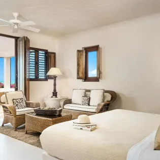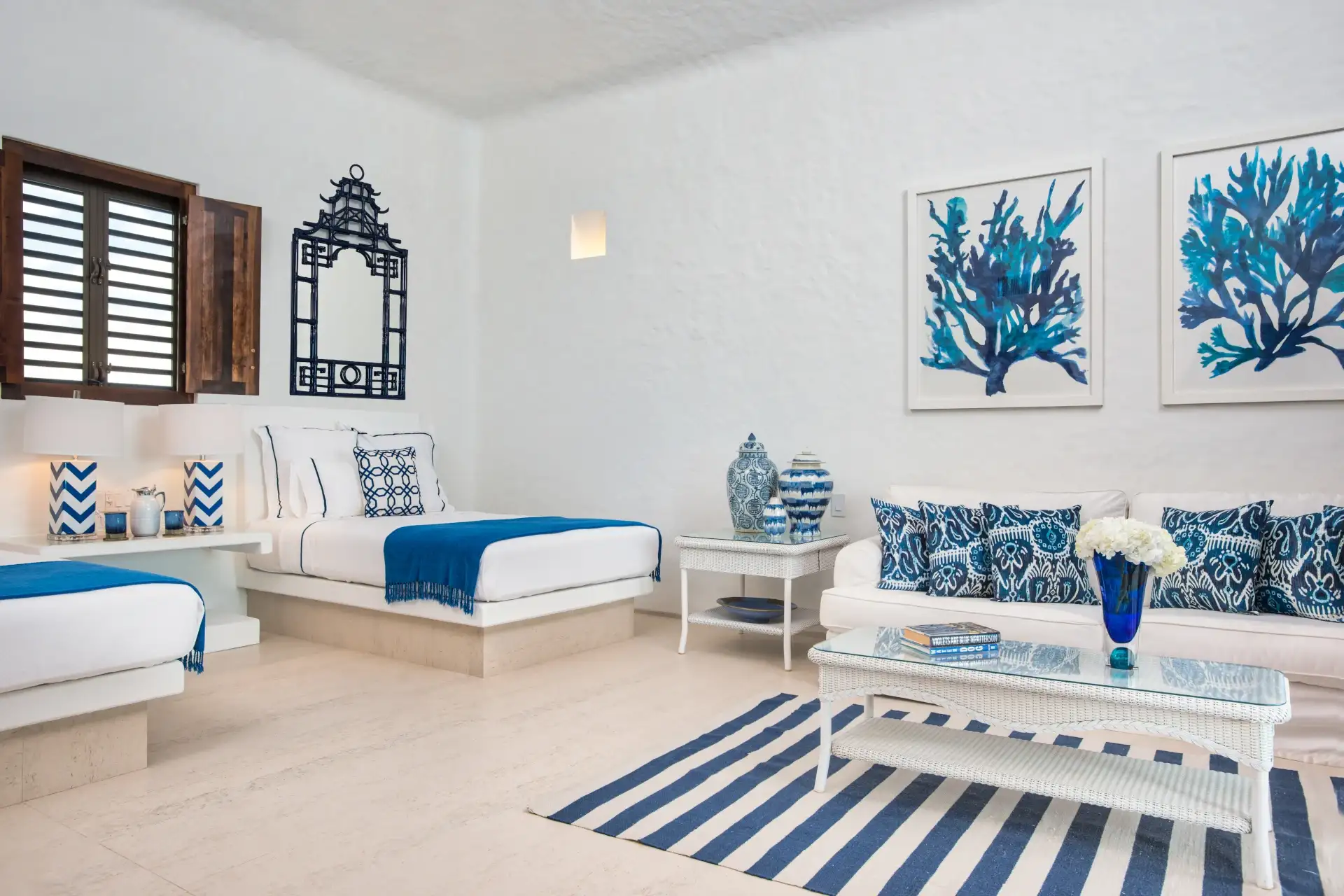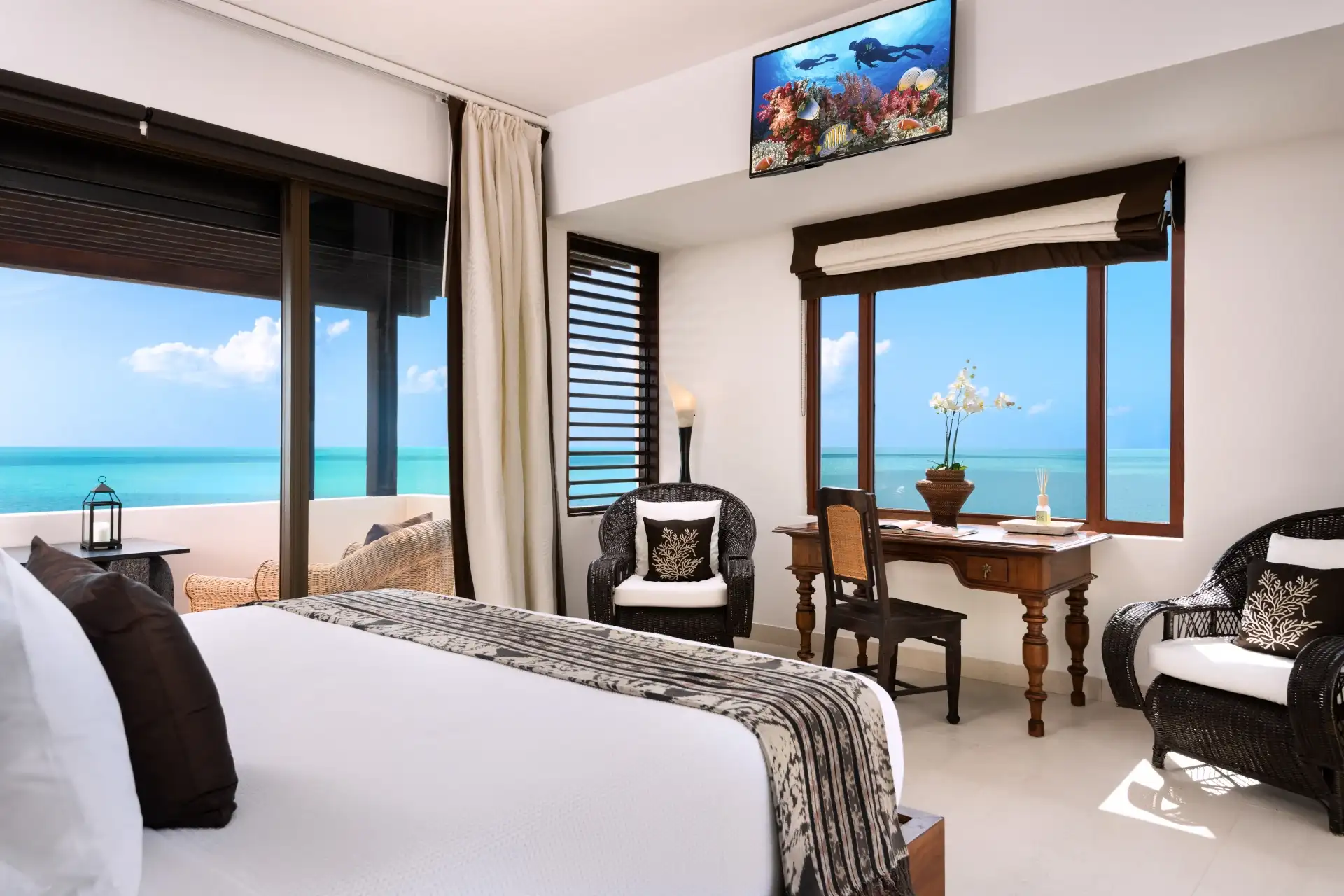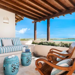 Another living room offers a more tranquil space to unwind, with plush sofas and chic, reclaimed wooden furnishings. Large windows let you overlook the glimmering ocean while you settle in with a good book or a quiet glass of wine.
