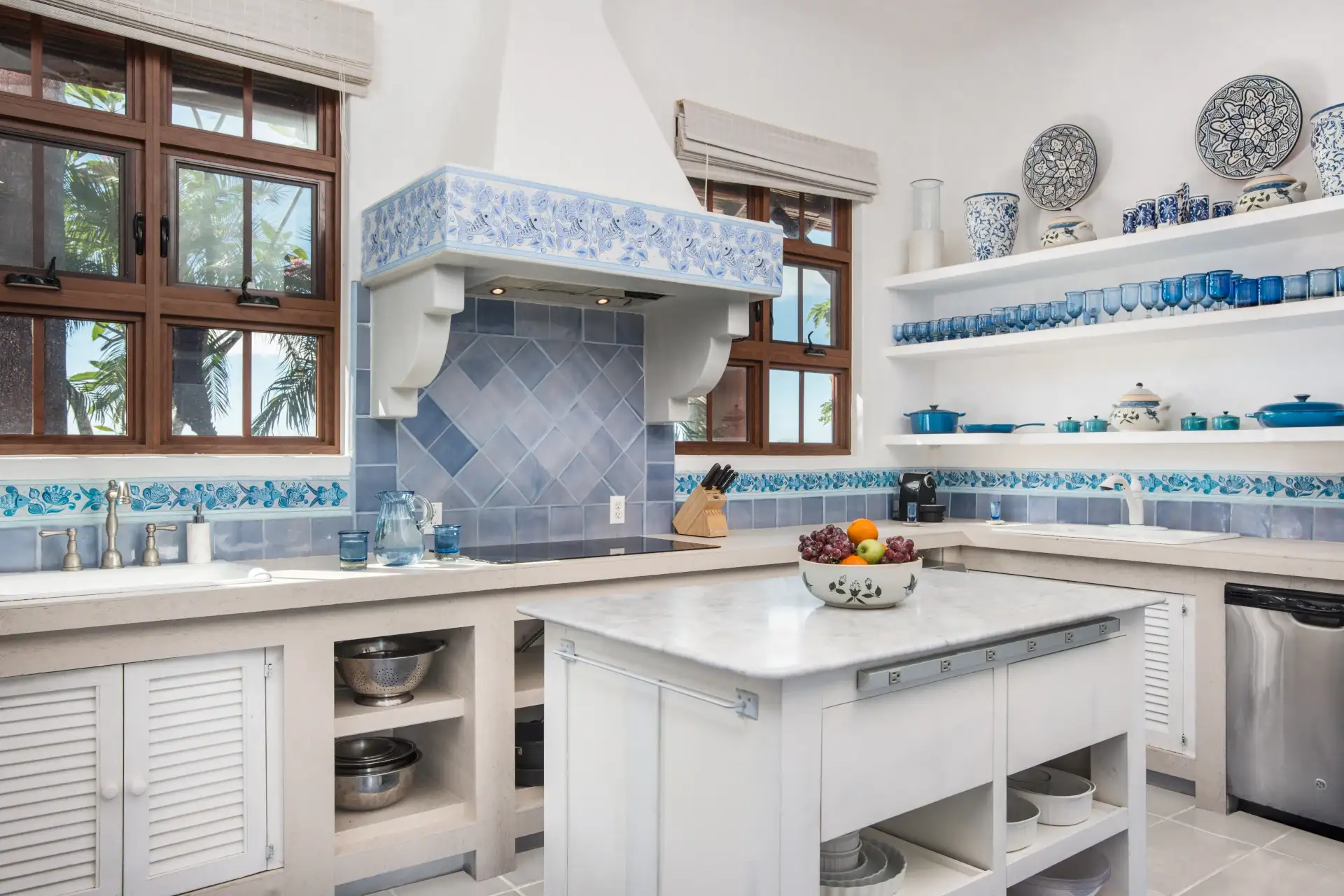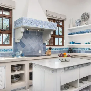 Bajacu Villa’s gourmet kitchen is spacious and well-equipped with the latest amenities. Blue trim and colorful mosaic decorations give the entire space a homey and welcoming feel.