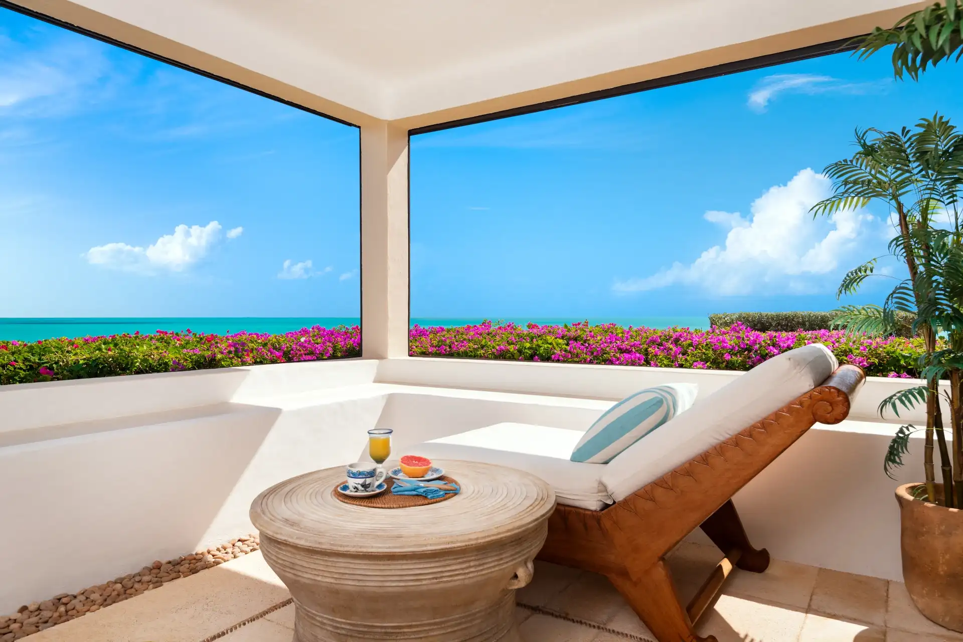 Stepping down into the landscaped garden lets you experience the beautiful tropical beauty of Turks and Caicos in privacy. You’ll find coconut trees, royal palm, fruit trees, bougainvillea, and more. Villa Bajacu even grows its own fresh fruits on the estate, perfect for an alfresco lunch.