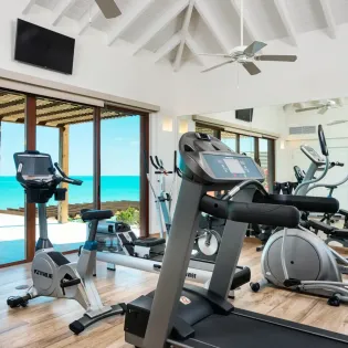 The dining room near the kitchen seats 16 guests, making it a great place to host gourmet dinners. For alfresco meals, a covered dining area is available next to the gas grill outside, a perfect setting for a Turks and Caicos fish fry.