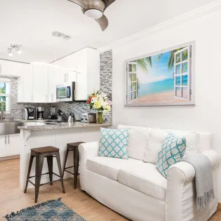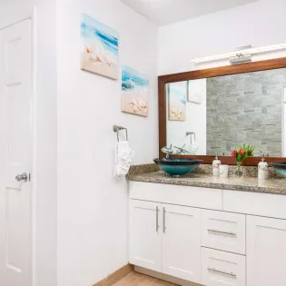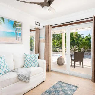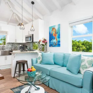 This cozy beach house villa features high-quality materials and stunning simplicity. Natural light streams through windows in every room, illuminating colorful ocean artwork and tropical wooden furnishings. This is all about low-key luxury by the beach.