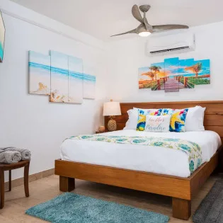 The second bedroom is on the ground floor, featuring a plush queen-sized bed. Colorful pictures and stylish wooden furnishings make this room a wonderful oasis loaded with tropical charm.