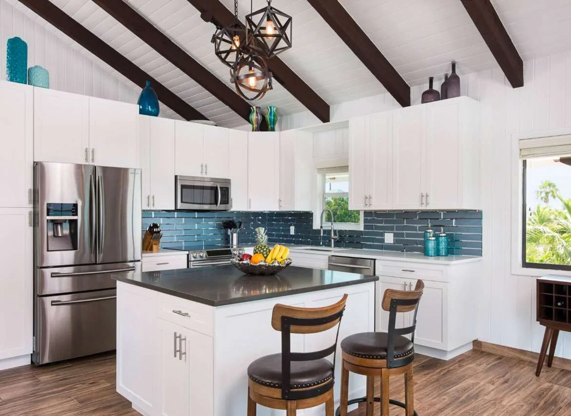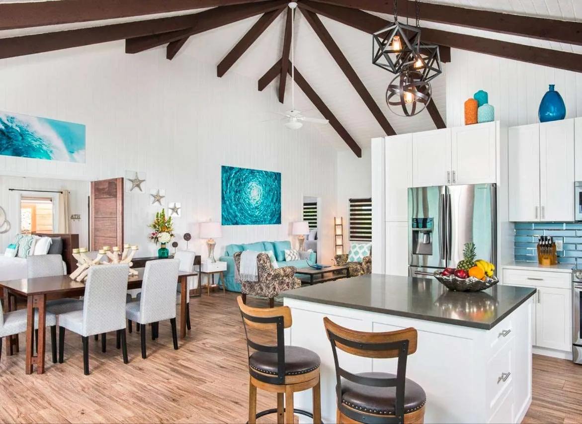 The great room is at the heart of Villa Bashert, home to the living room, dining area, and kitchen. Vaulted ceilings with exposed wooden beams bring a rustic touch, while ocean art and white walls mirror the water and sand outside.