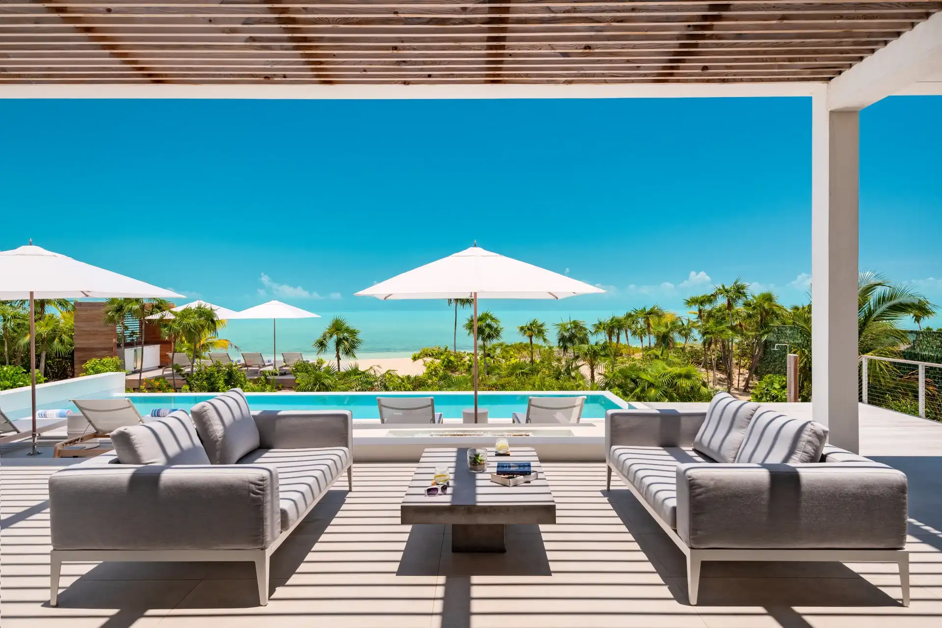 The large open-plan living space in this Long Bay Villa consists of the living room, dining room, and kitchen. Large sliding glass doors open to reveal an expansive outdoor setting, with covered terraces, sun decks, and the inviting infinity pool. The other side of the villa has a tranquil patio overlooking a lush tropical garden.