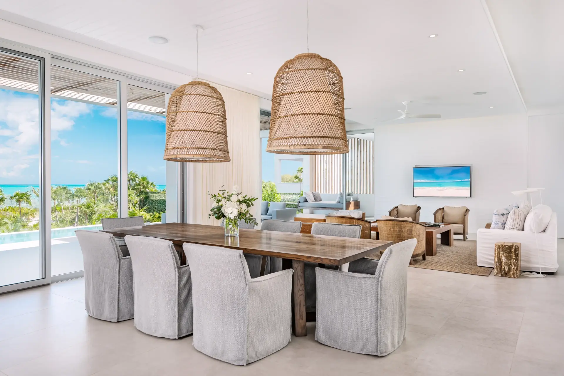 The glossy wooden dining room table at this Beach Enclave Villa in Long Bay, with space for up to 10 people. Everyone will love gathering here over a delicious meal, discussing the day’s activities.