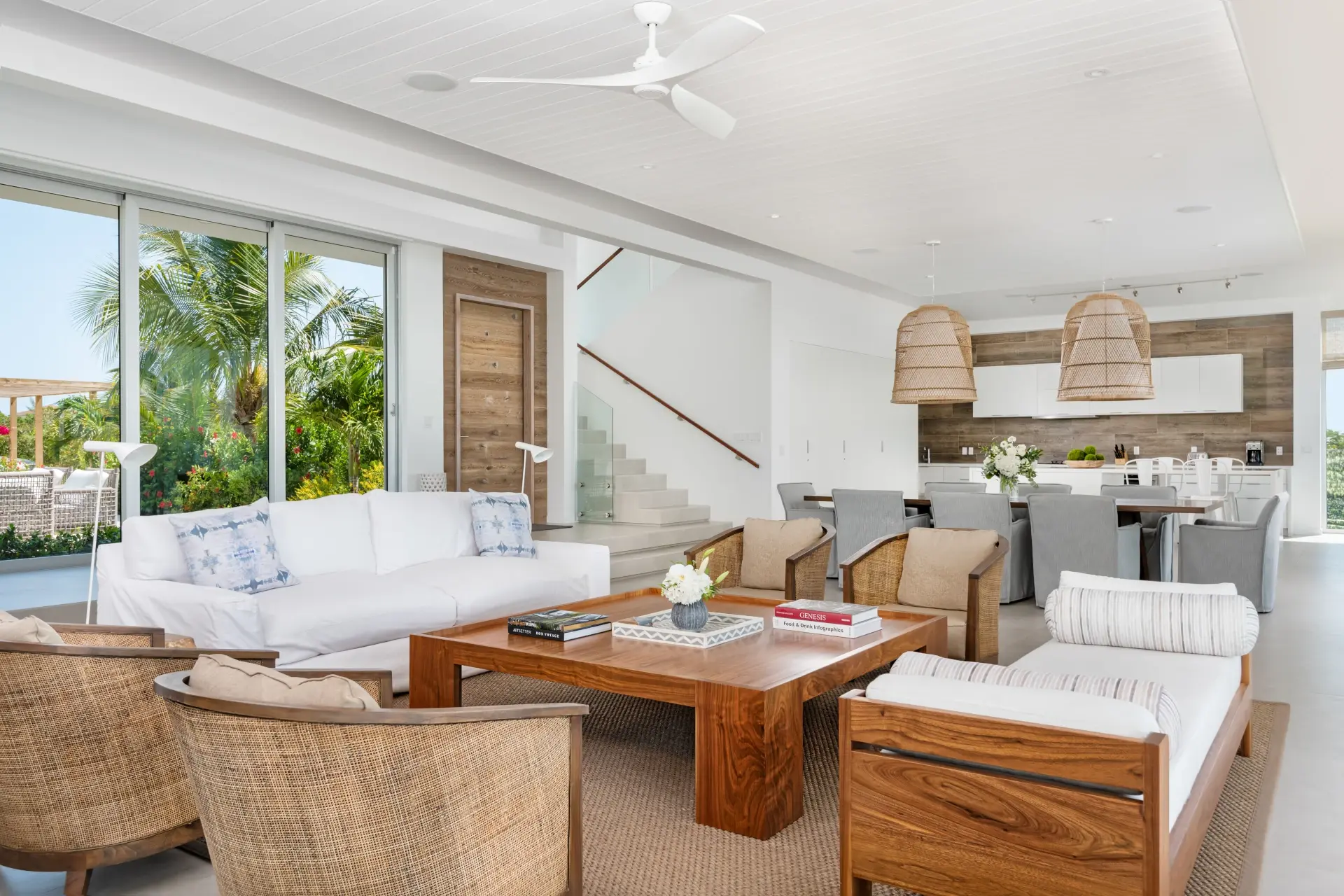 The beautiful living room features a deluxe L-shaped sofa on top of a woven rug, providing some Caribbean texture. A solid wood coffee table and a pair of beige armchairs add a rustic flair.