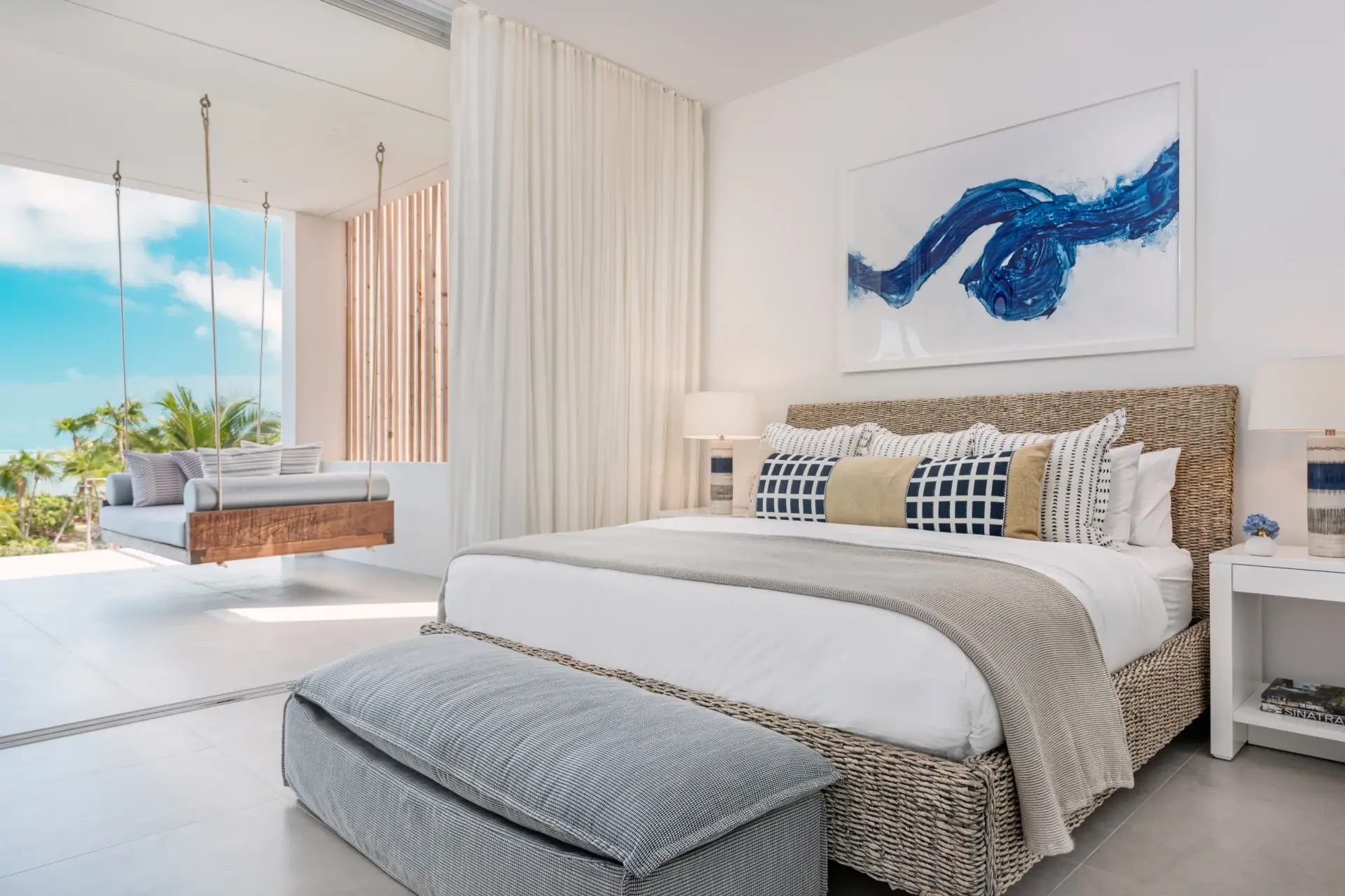 The contemporary bedrooms in this Long Bay Villa each come with a king-sized bed and ensuite bathroom. Contemporary design, ocean views, and a soft neutral color palette bring the most out of the island décor.