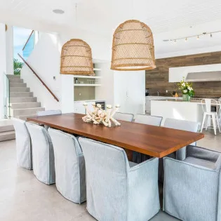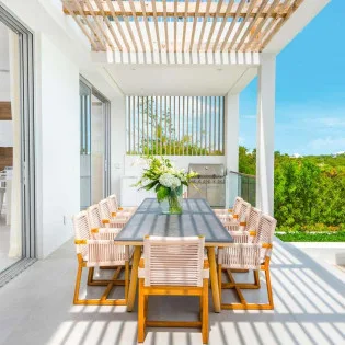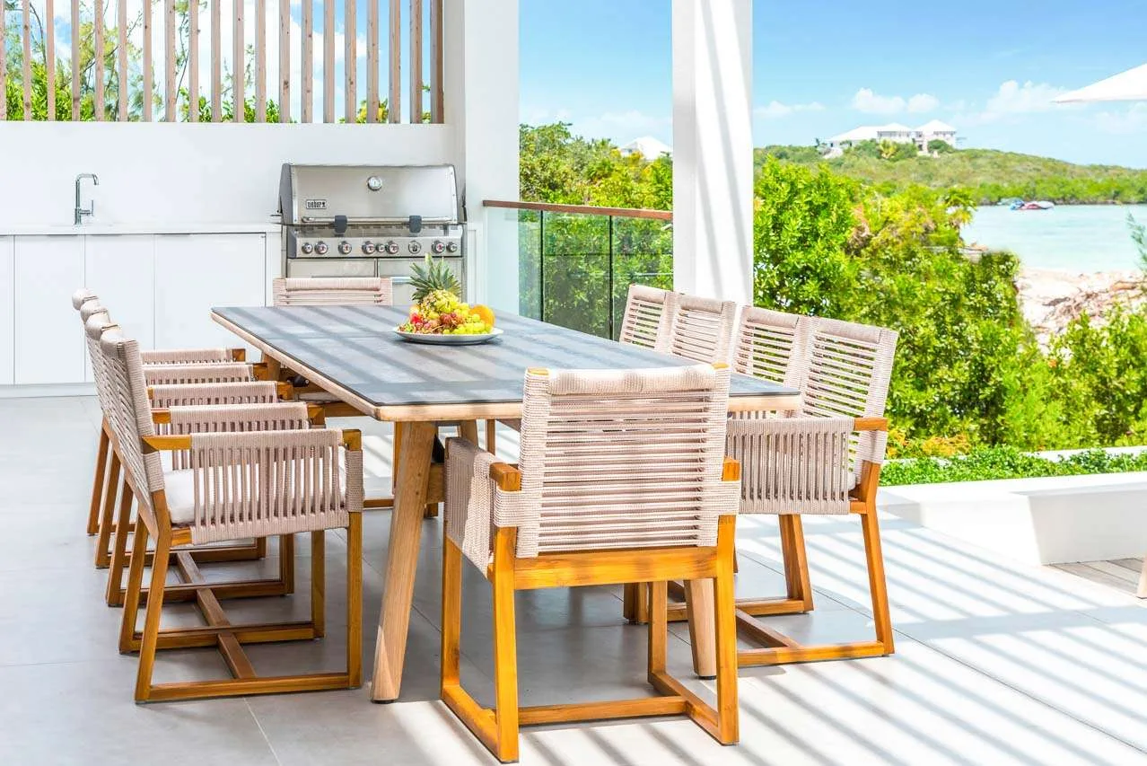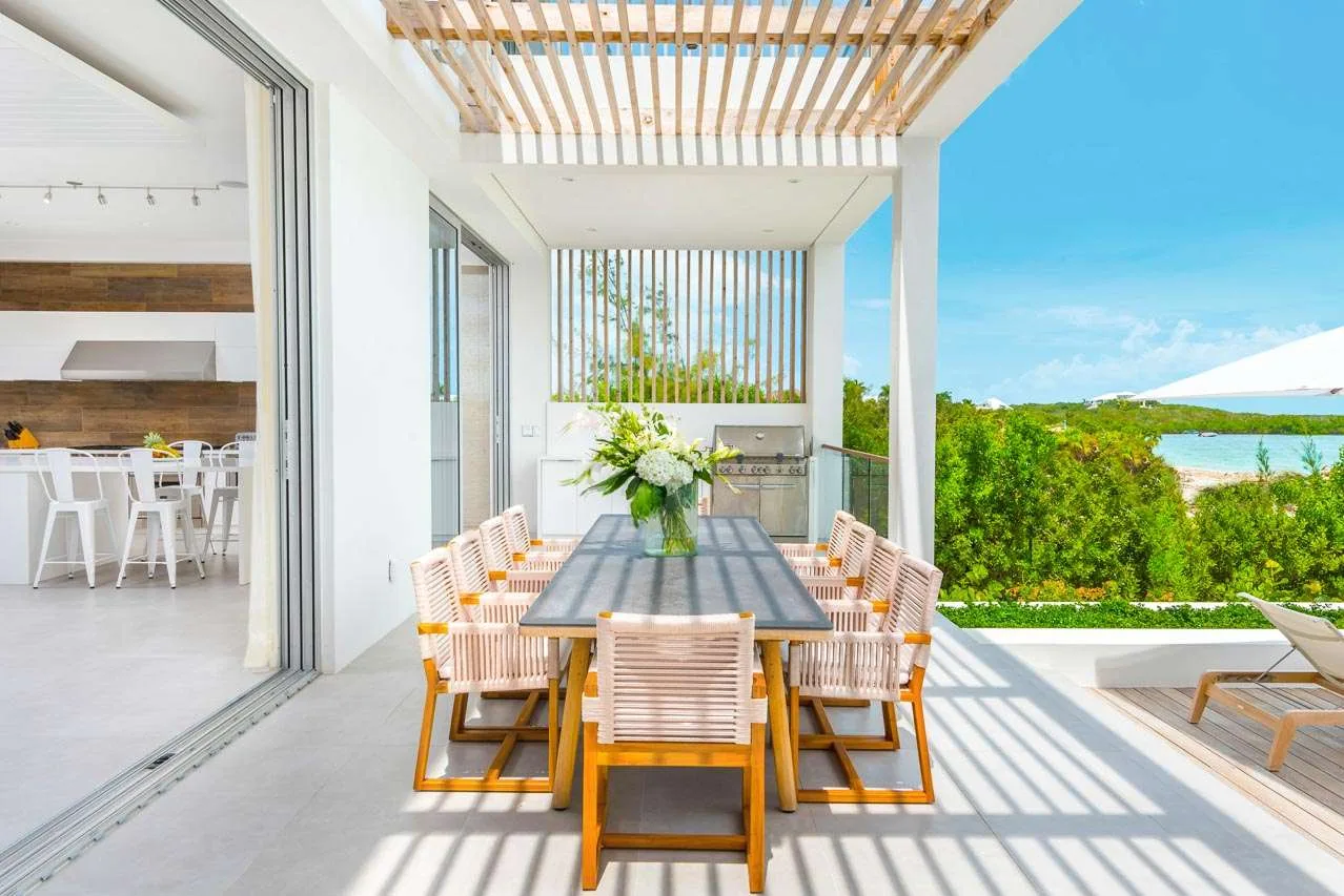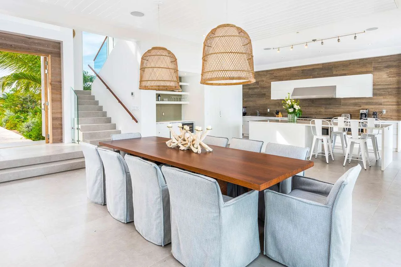 The roomy kitchen is stylish and modern, well-appointed with all the amenities you need to prepare chef-level meals. A large kitchen island doubles as a casual breakfast bar, a space to enjoy an early morning espresso as the sun rises. Your cooking space also extends outside, where you’ll find a bench and large gas grill – the perfect place to barbecue some freshly caught fish. The glossy wooden dining room table at this Beach Enclave Villa in Long Bay has space for up to 10 people. Everyone will love gathering here over a delicious meal, discussing the day’s activities. Alfresco dining is also an option at the large outdoor table. This is a perfect spot for fresh lunches and sunset drinks, watching the stars appear as the rosy gold sunset flares up over the ocean.