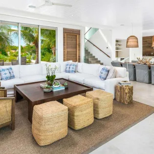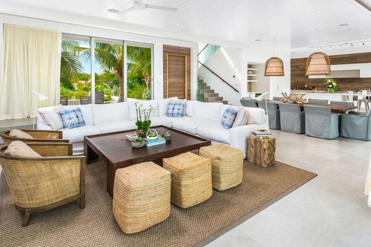 The large open-plan living space in this Long Bay Beach Enclave Villa consists of the living room, dining room, and kitchen. Generous sliding glass doors open to reveal an expansive outdoor setting, with covered terraces, sun decks, and the inviting infinity pool. The other side of the villa has a tranquil patio overlooking a lush tropical garden. The beautiful living room features a deluxe L-shaped sofa on top of a woven rug, providing some Caribbean texture. A solid wood coffee table, and a pair of beige armchairs add a rustic flair. Natural light fills the room, glancing off the white-washed walls and lofty ceiling. You’ll love gathering here to relax, admire the view, or simply sink into the sofa for some good conversation.