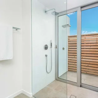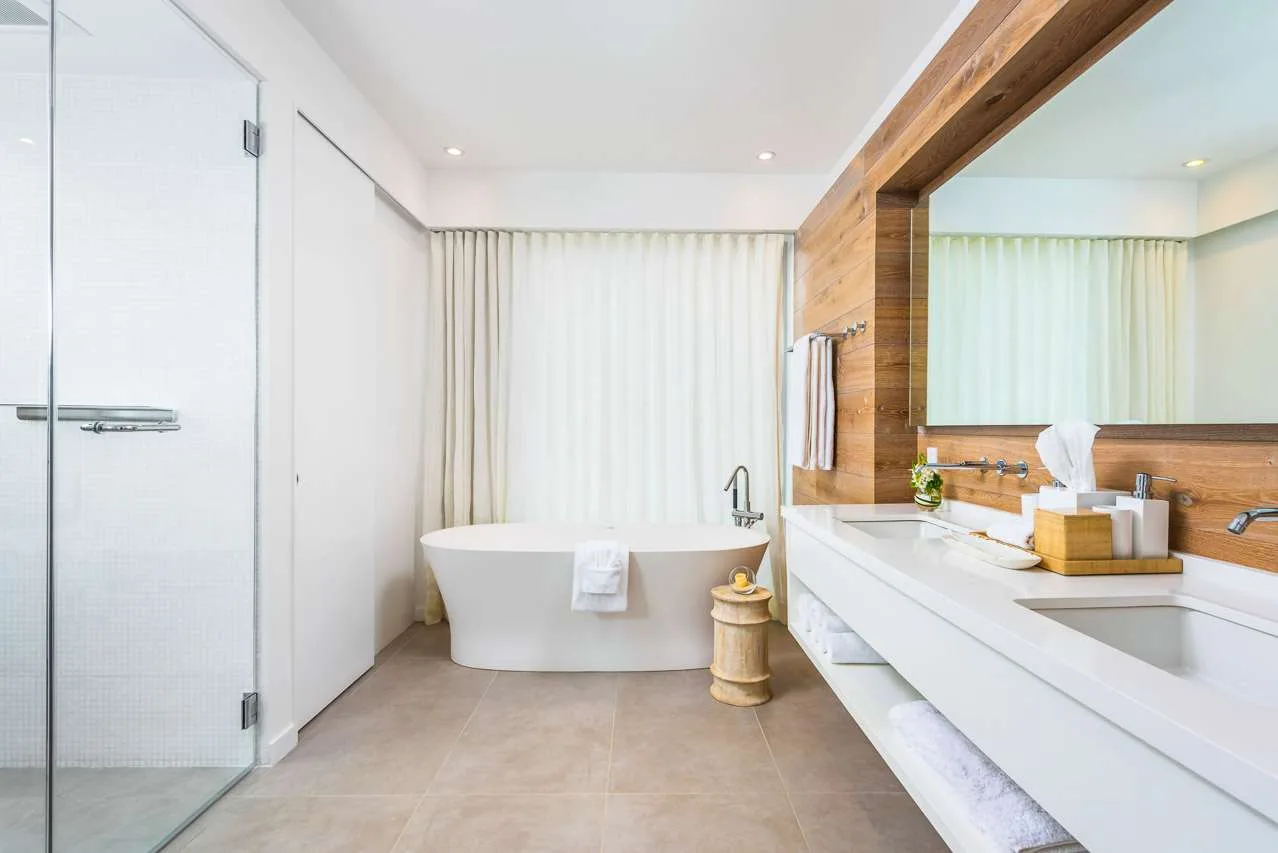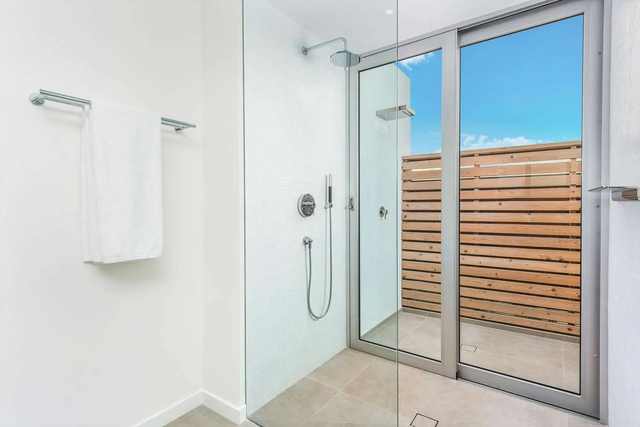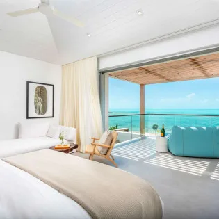 The 5 contemporary bedrooms in this Beach Enclave Long Bay Villa. Each comes with a king-sized bed and ensuite bathroom. Contemporary design, ocean views, and a soft neutral color palette bring the most out of the island décor. The two master suites (one on the ground floor and another on the second floor) also come with an outdoor shower, a relaxing way to wash off the salt and sand. Terraces with deep-backed and soft chairs let you gaze at the horizon and settle in with a good book or glass of champagne. The 6th bedroom is located in its own secluded cottage. This tranquil space is perfect for those seeking a bit more privacy and includes its own kitchenette, sitting room, and covered terrace.