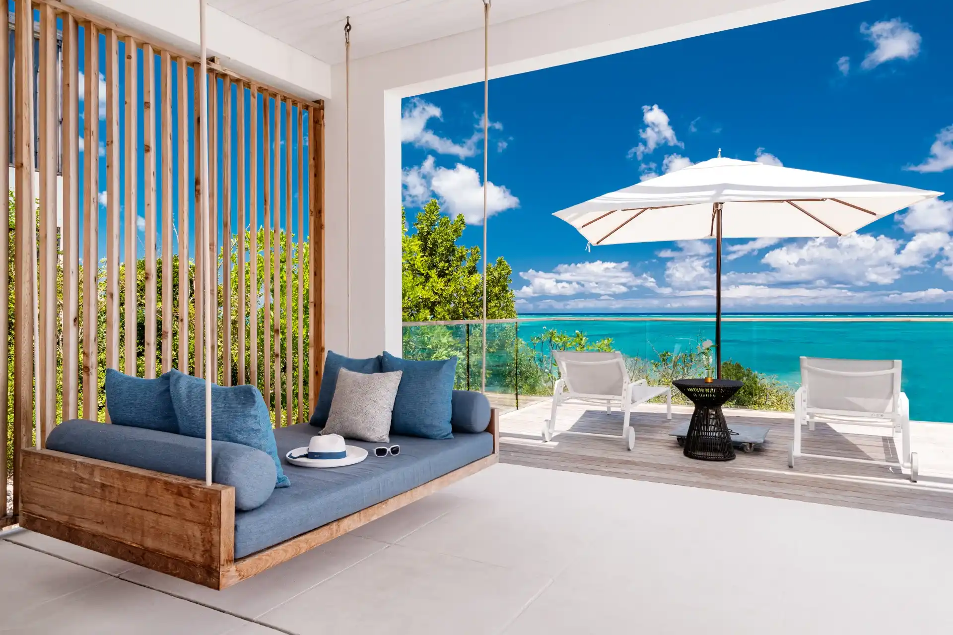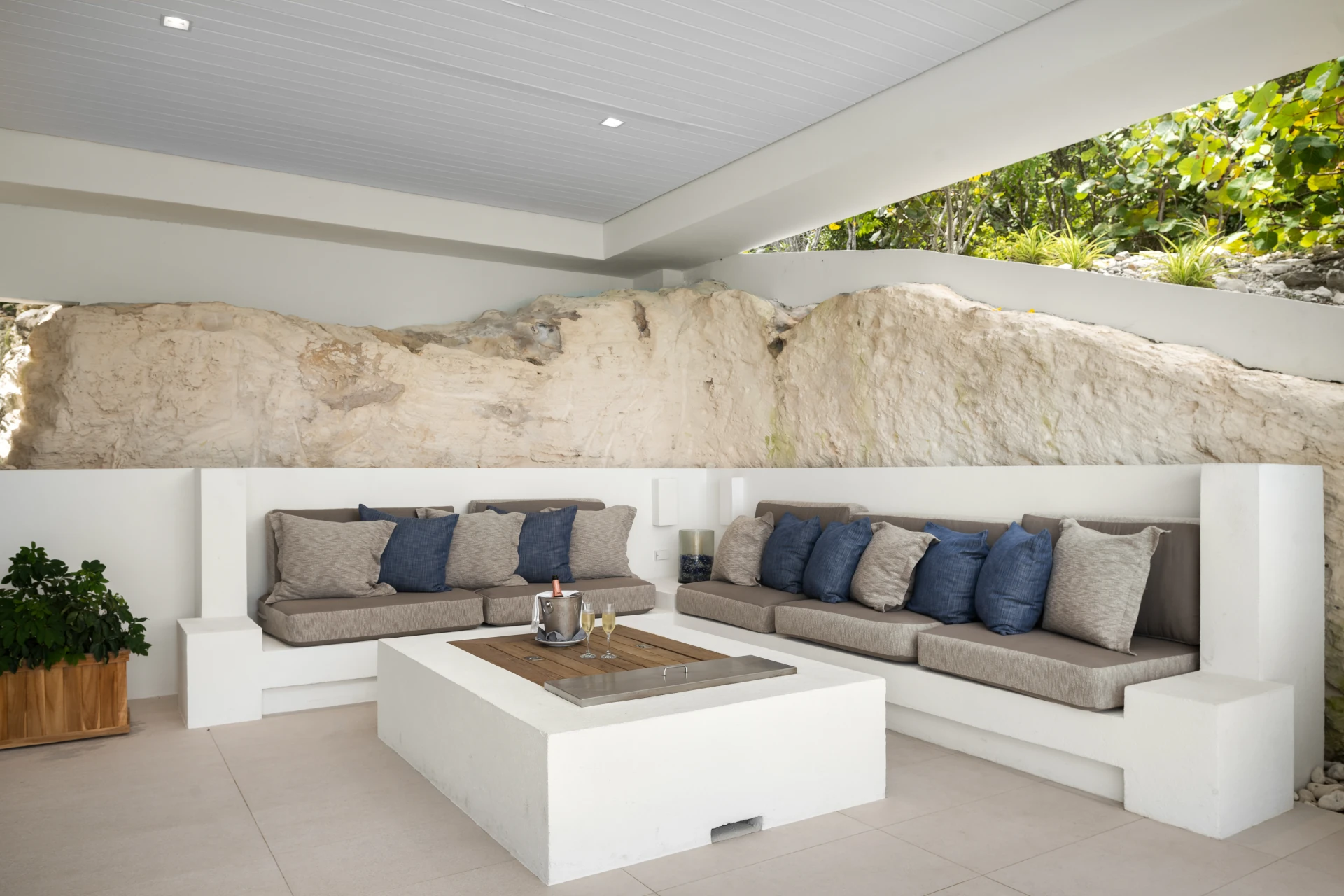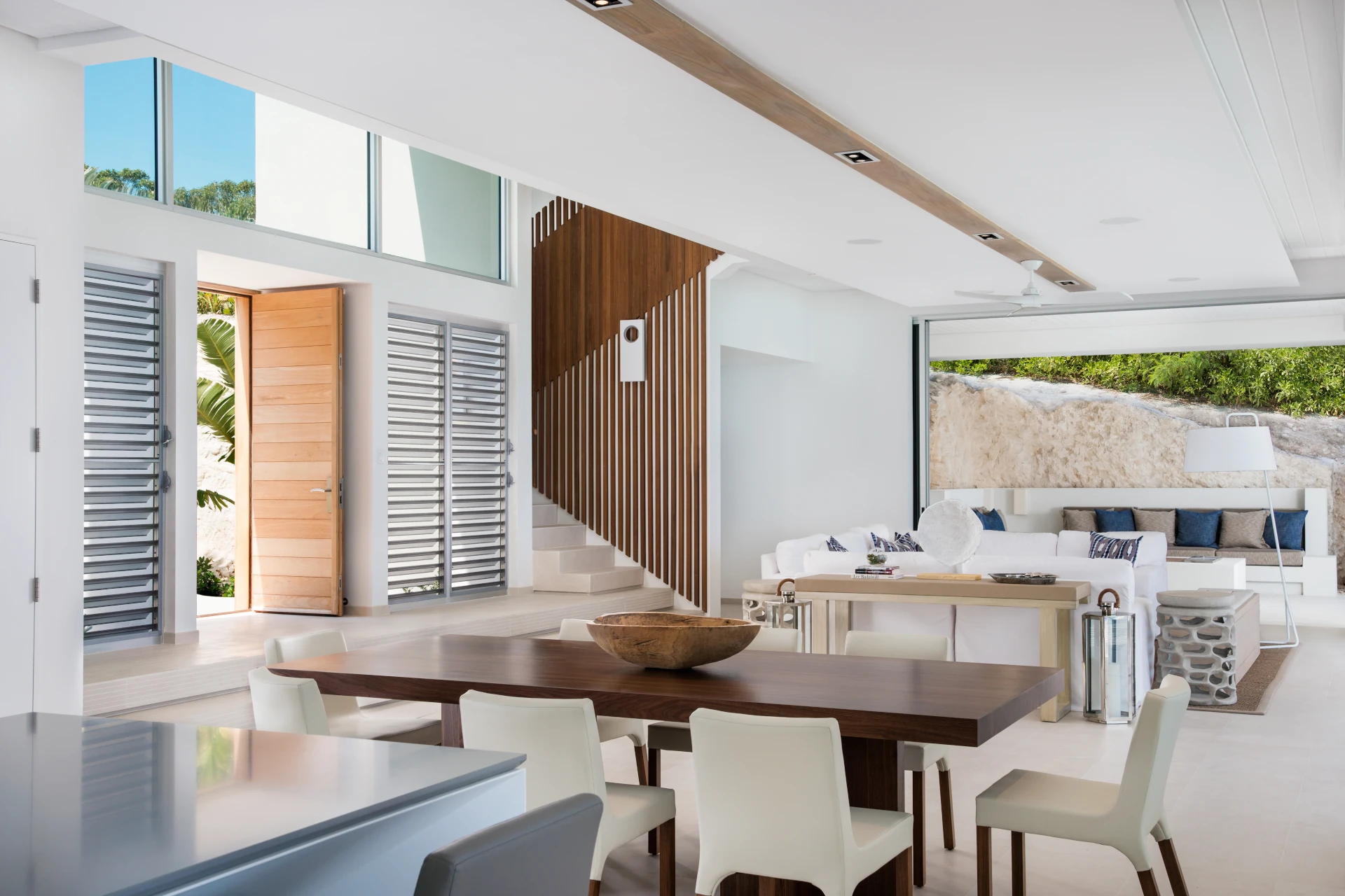 A staircase carved into the limestone cliffs leads you out onto your secluded stretch of sand, with a private area for each villa. The area is made even more special with a private wood deck, shaded by natural vegetation and featuring a summer kitchen, fire pit, and outdoor shower.