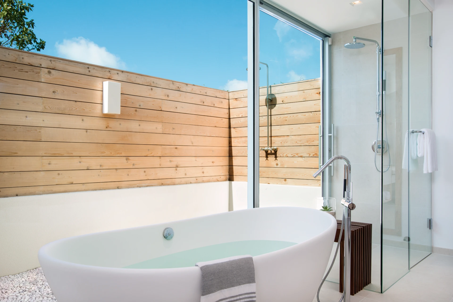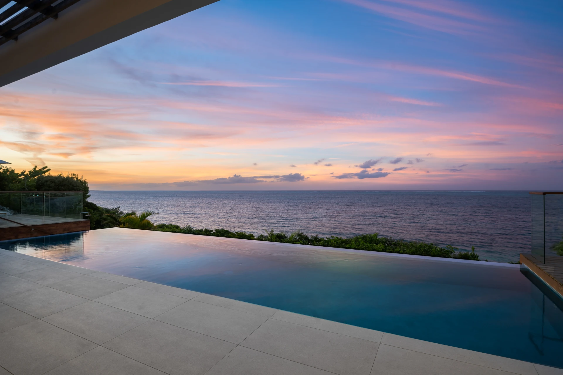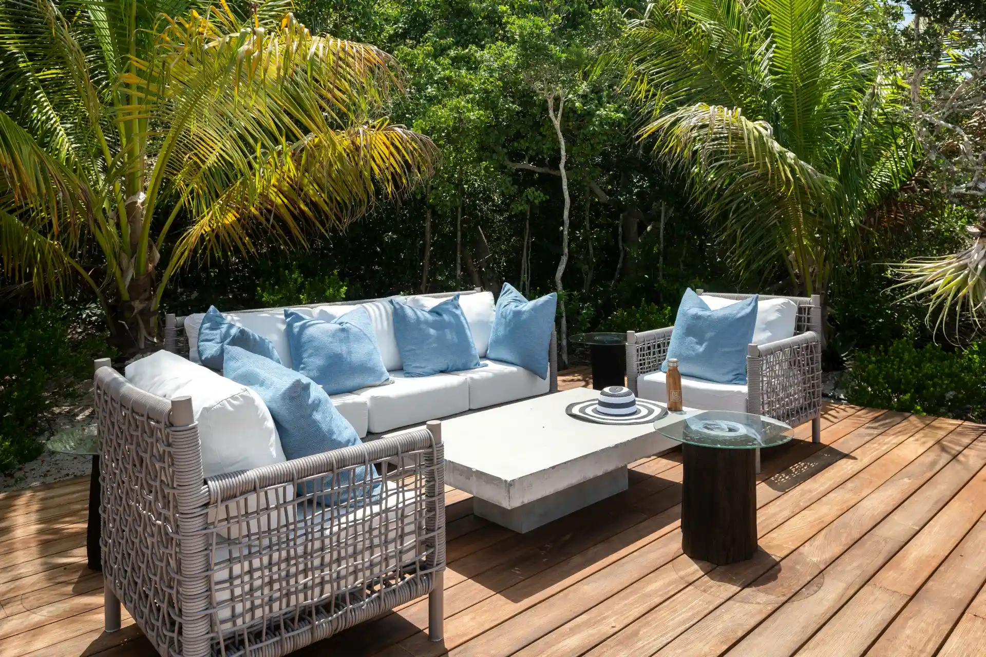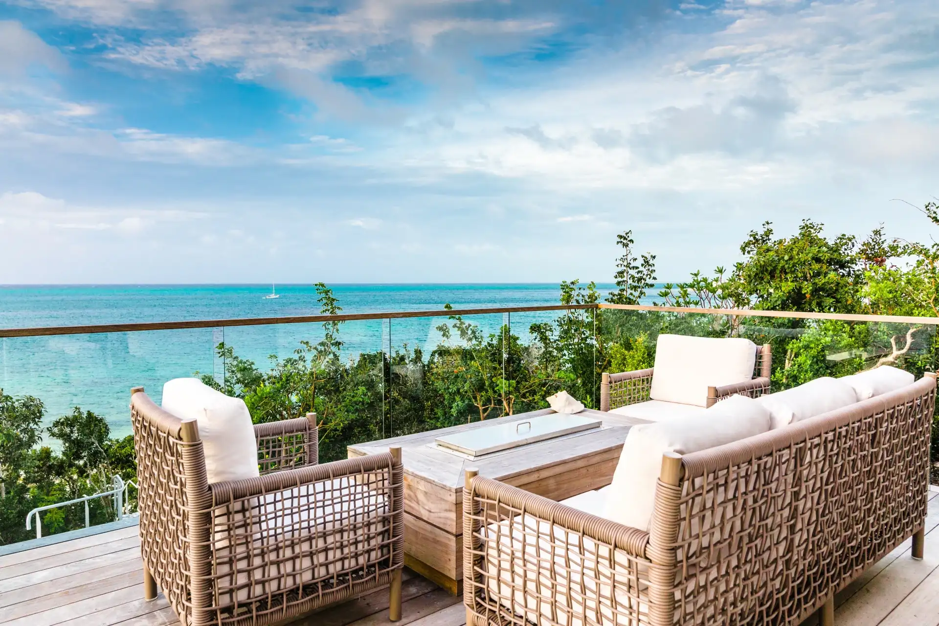 A staircase carved into the limestone cliffs leads you out onto your secluded stretch of sand, with a private area for each villa. The area is made even more special with a private wood deck, shaded by natural vegetation and featuring a summer kitchen, fire pit, and outdoor shower.