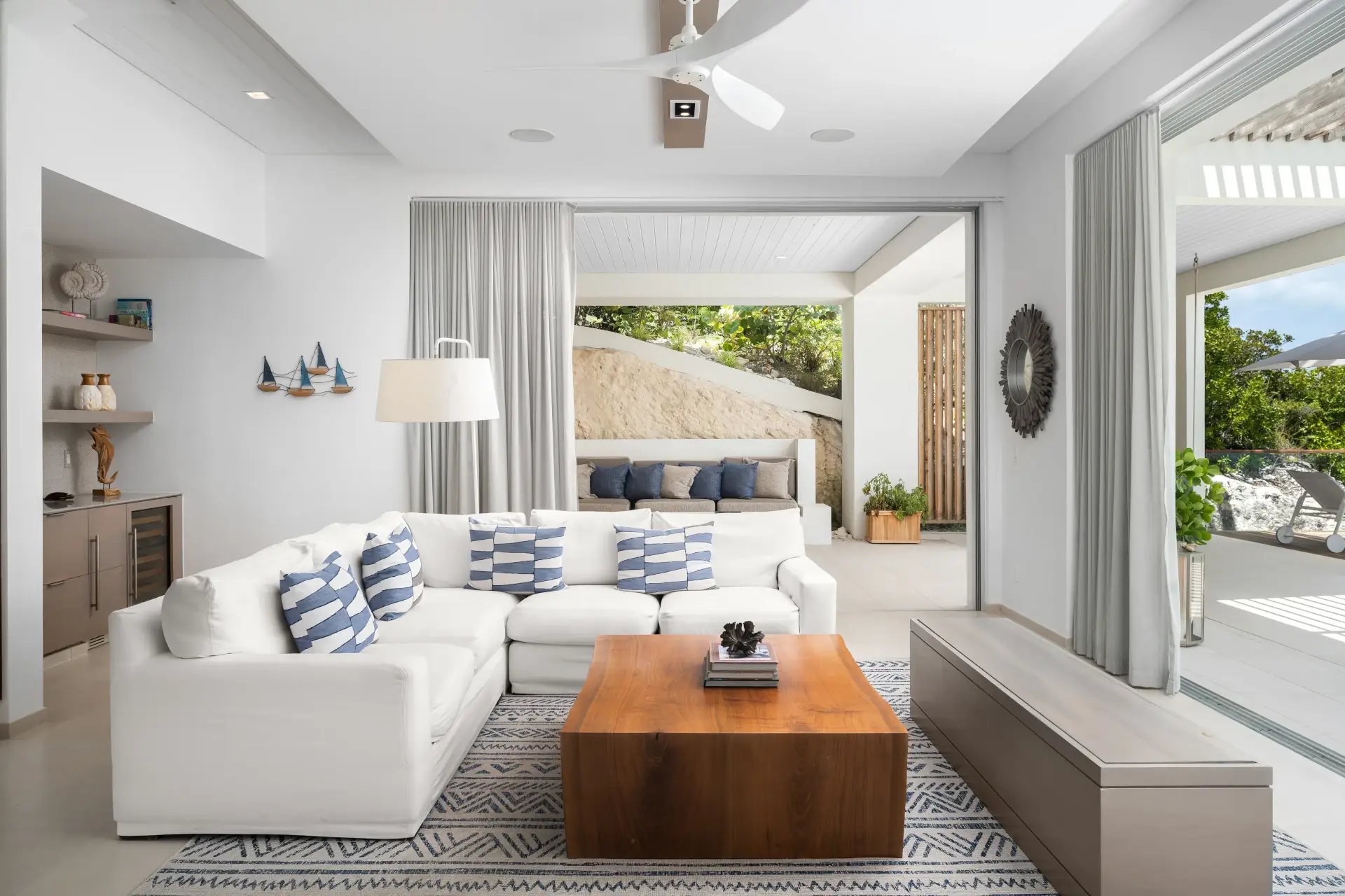 The downstairs great room is open, airy, and spacious. Clean lines and modern style make this place the perfect heart of the home, while the huge glass doors open to bring the tropical breezes inside.