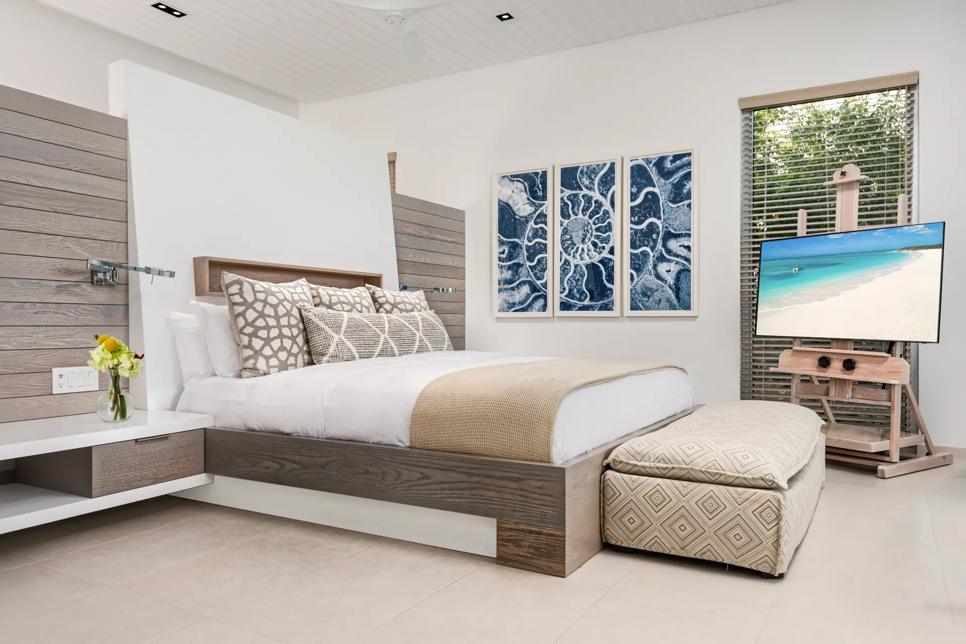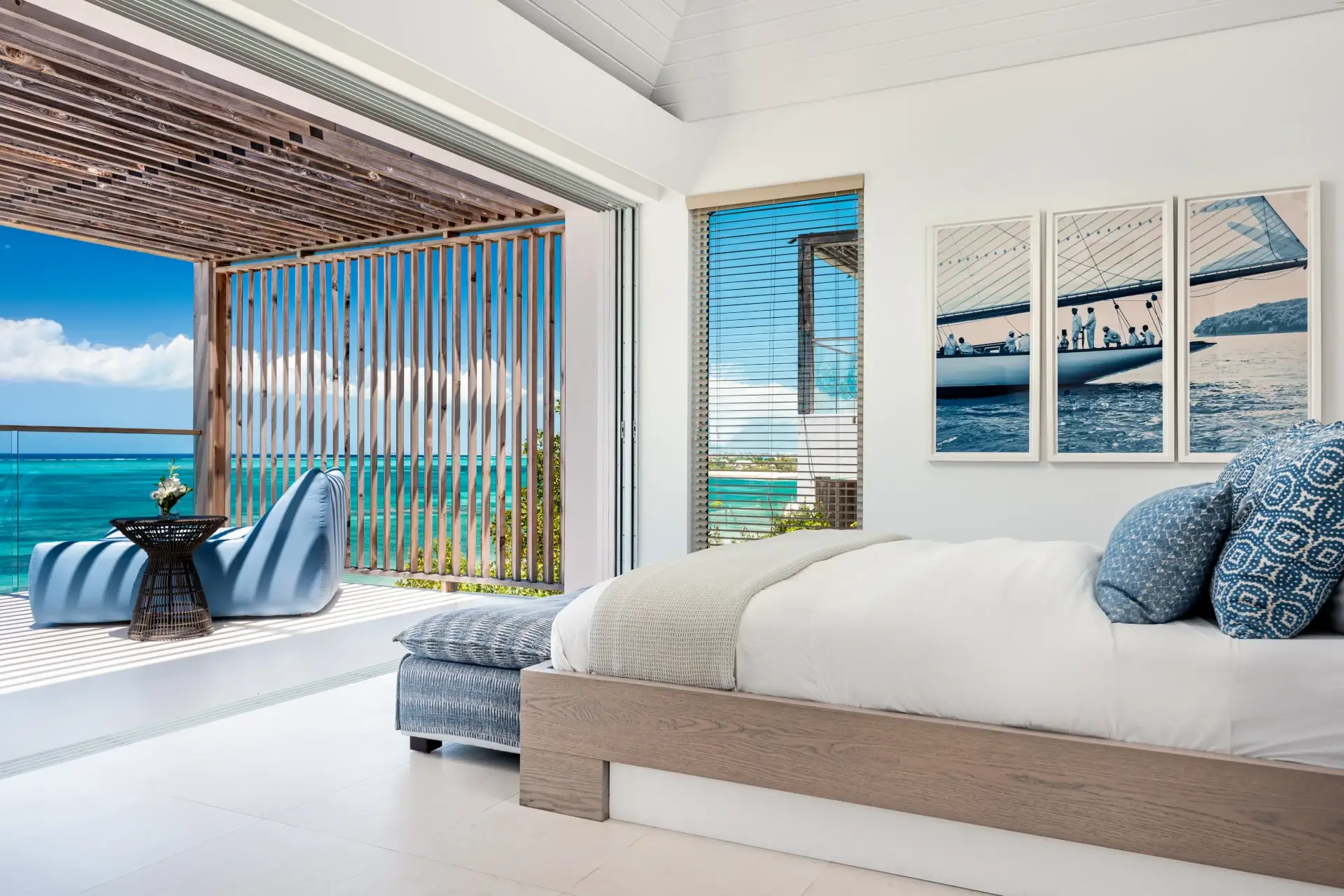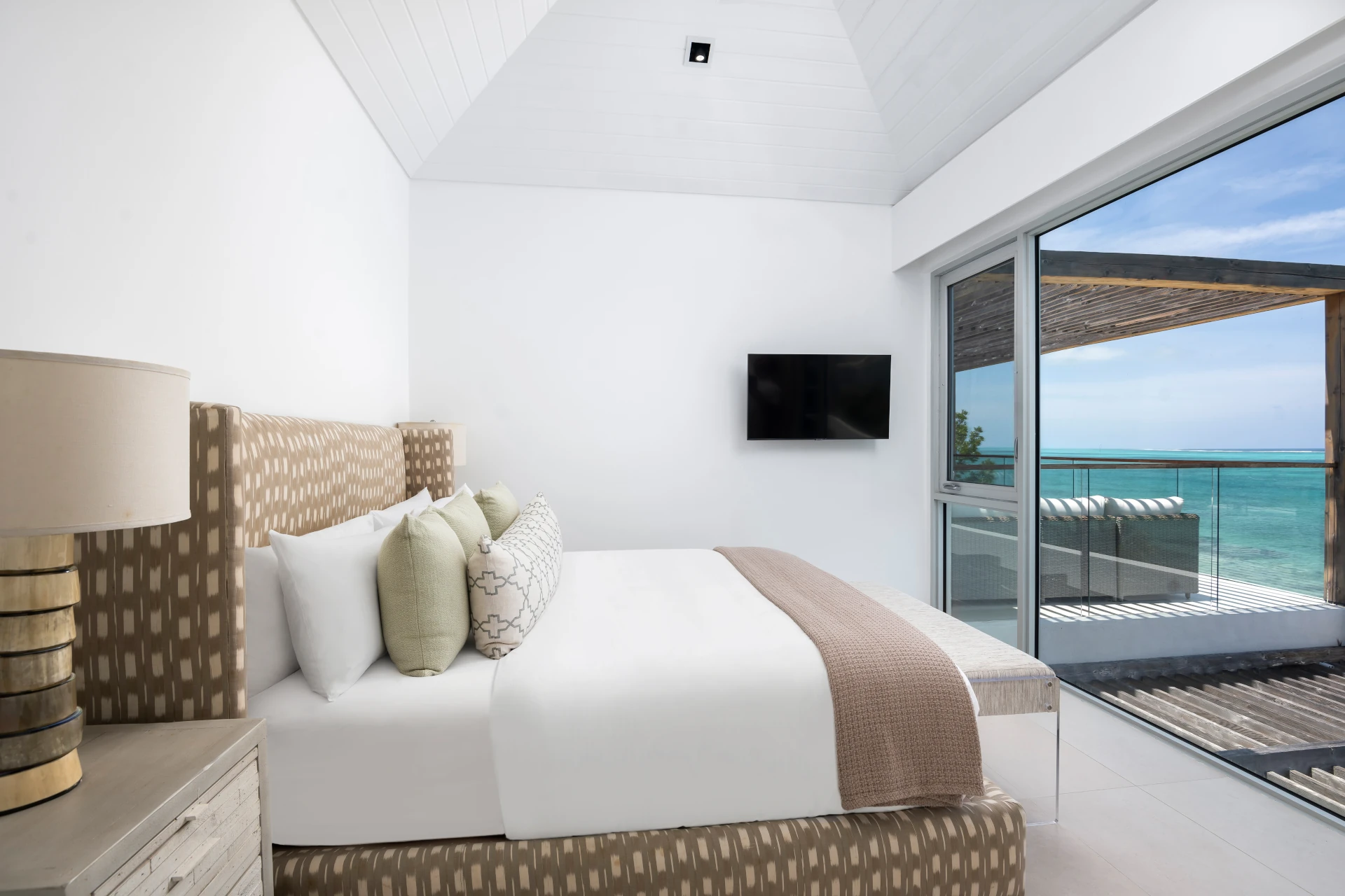 Each bedroom offers stunning ocean views, ceiling fans, a TV, and an ensuite bathroom. There are four bedrooms with luxurious king-size beds, while the fifth bedroom has the option to be furnished with either two twin-size beds or another king. All are quiet, tranquil places to relax in.