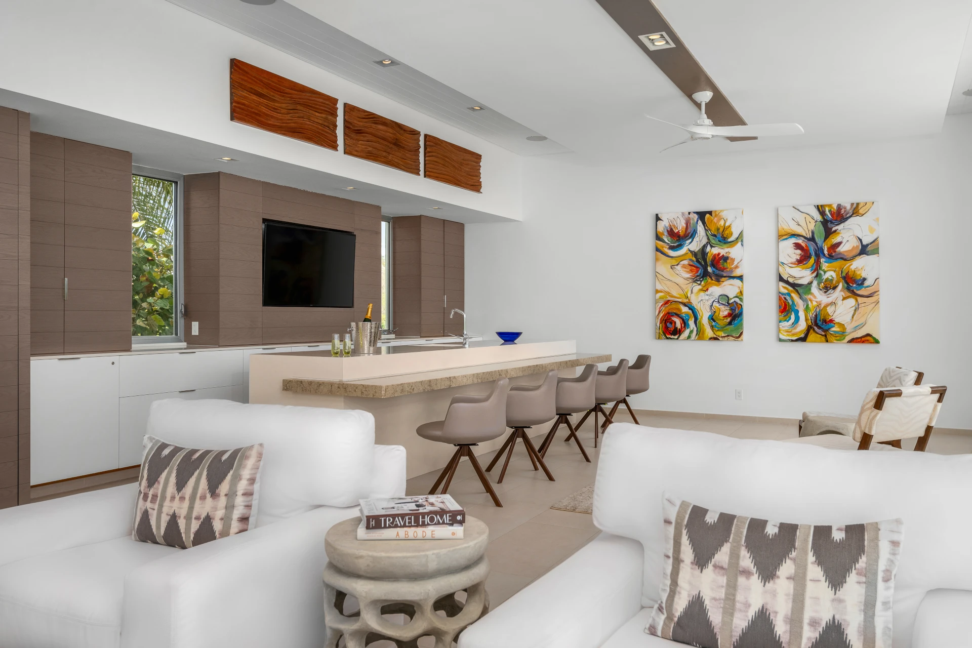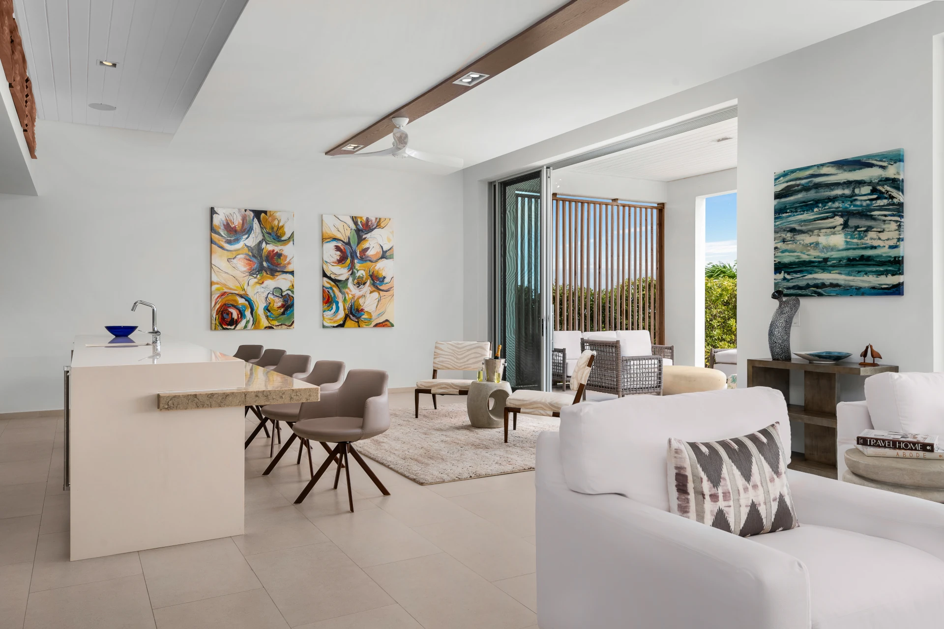 A living room features luxurious white sofas looking out towards the ocean. This is a great spot to relax with a tropical cocktail, or simply enjoy some conversations in comfort. Textured island furnishings and colorful artworks add pops of color.