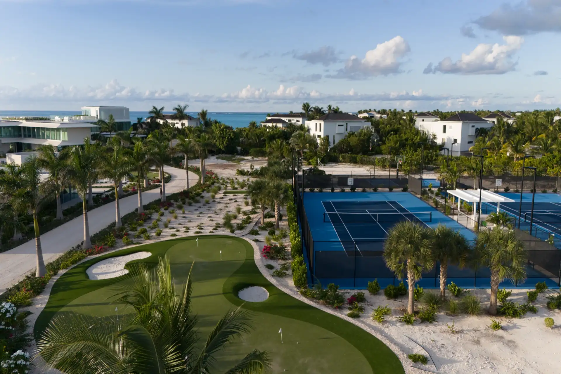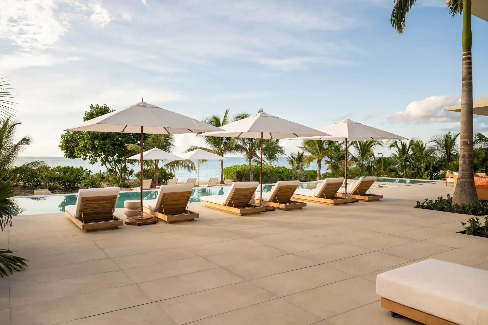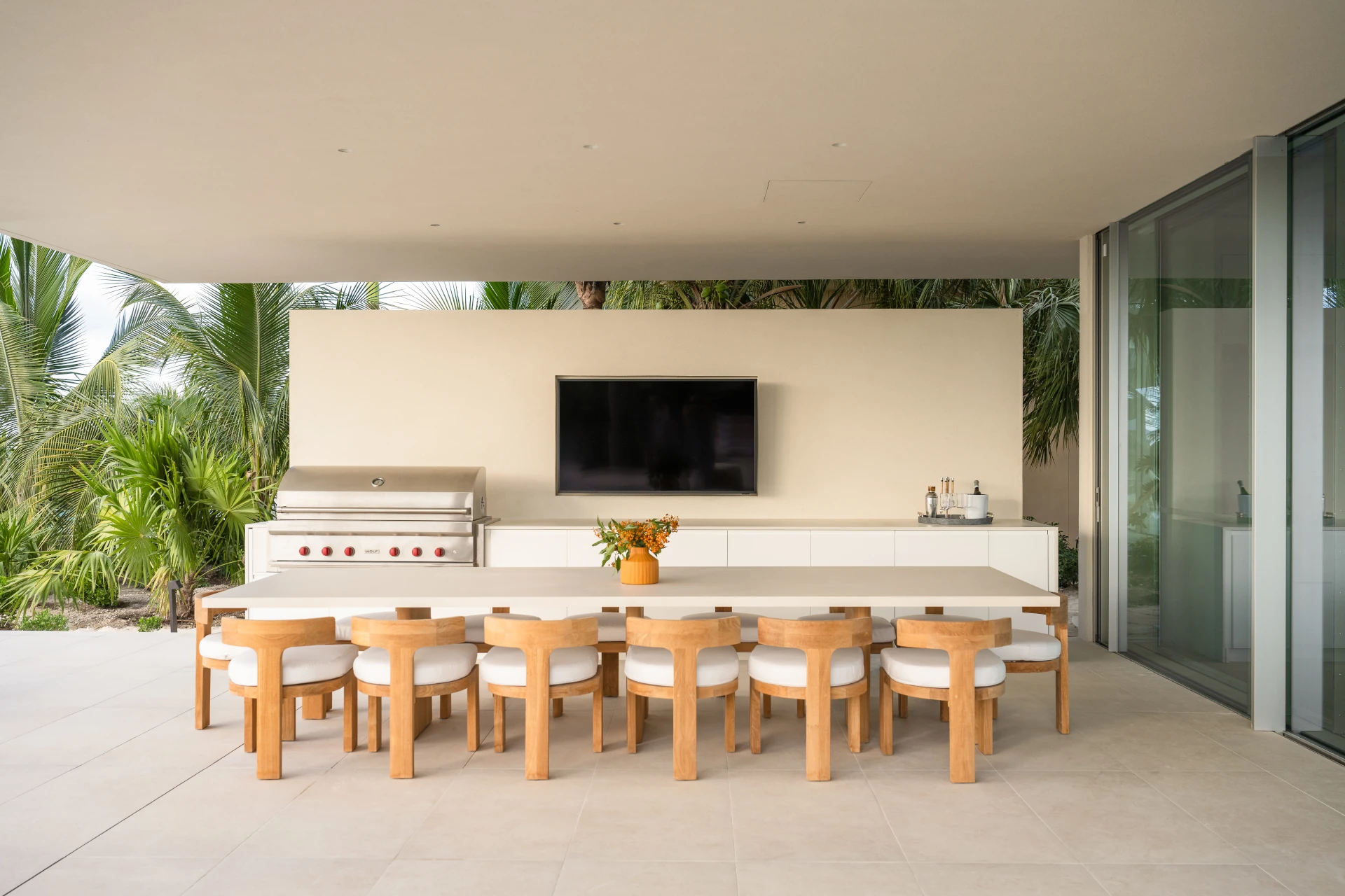 Crowning the villa, a rooftop terrace lounge provides panoramic vistas of Grace Bay Beach, complete with plush seating and a wet bar—an ideal space for sunset gatherings. Outside, a covered terrace, outdoor kitchen, alfresco dining area, pool, and sundeck invite guests to relax and enjoy the seamless flow between indoor and outdoor living.