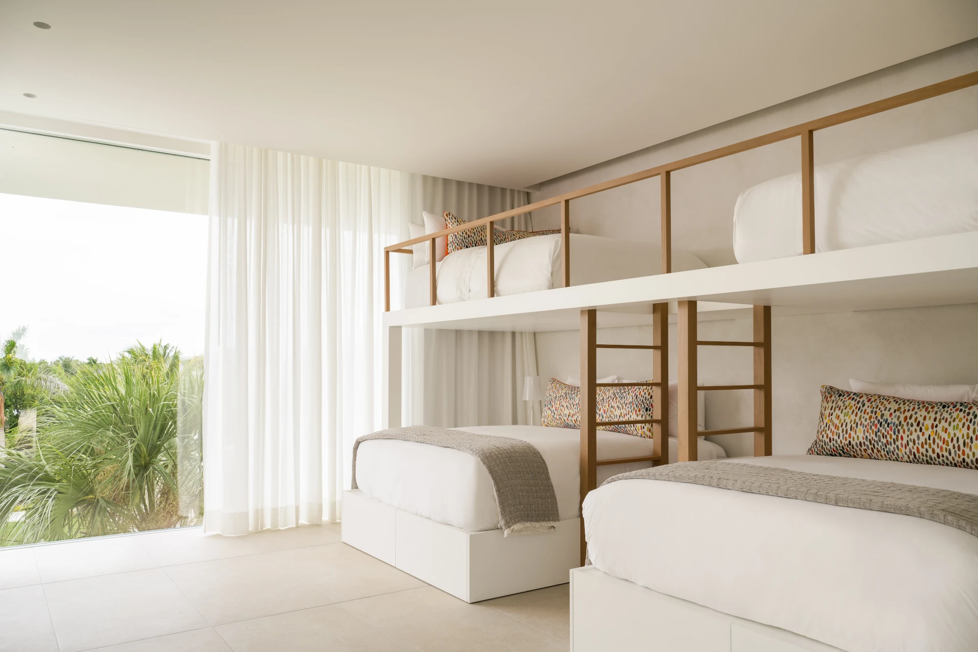 Upstairs, the ocean view primary suite opens to a private terrace, joined by two additional king bedrooms with breathtaking views and outdoor showers. Two versatile bedrooms can convert from king to twin beds, while two spacious garden view bunk rooms with queen-size lower bunks offer the perfect setup for children or teens.