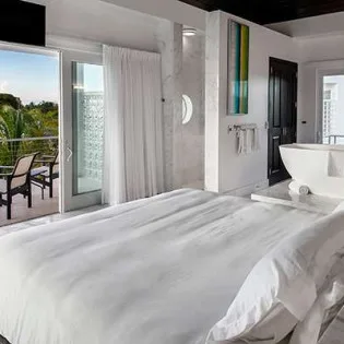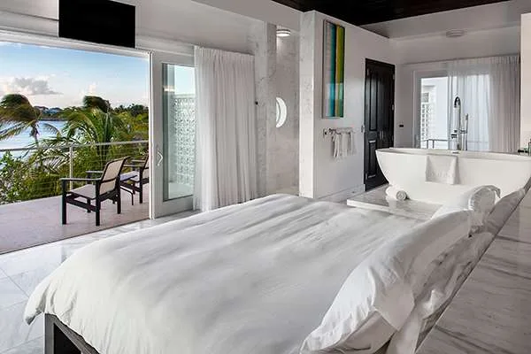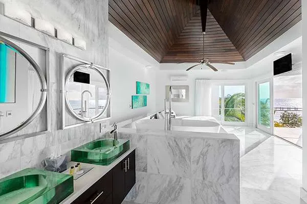 Bedroom: Ascending to the second level of Villa Capri reveals the dramatic and airy master bedroom. Featuring a king-sized bed, ensuite bathroom, a lavish soaking tub, and custom-made furnishings, you’ll feel like royalty sleeping here. The vaulted, Bali-style wooden ceiling is alluring, bringing an exotic jungle to the minimalist space. A balcony is the ideal setting for a morning coffee or evening aperitif, listening and watching as the ocean washes over the white sand.