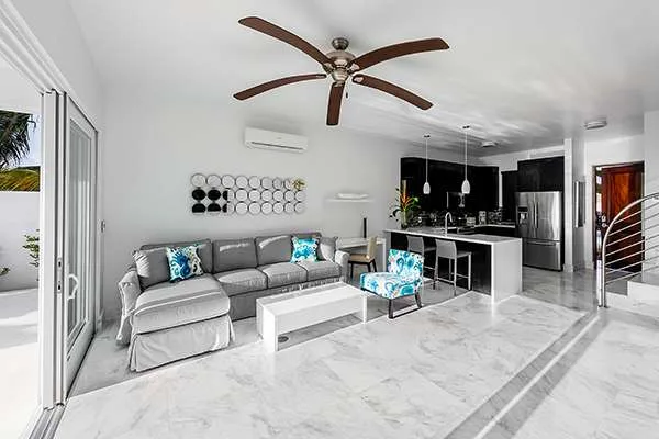 Villa Capri features two levels of living space complete with amazing views of the turquoise water and sky. Contemporary décor and stylish furnishings make for one dreamy stay on the island, while chic and creamy neutral tones are contrasted with tropical wooden trim.