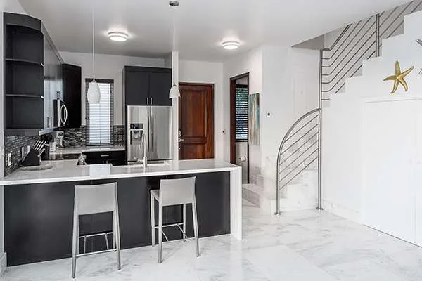 Kitchen and Dining Room: The beautiful mahogany kitchen at Villa Capri comes with everything you’ll need to whip up gourmet meals during your stay. Sleek appliances make cooking a breeze, and a breakfast bar is a great spot for a quick espresso before ducking out to the pool in the morning. The kitchen is complemented by a gas grill on the patio, encouraging island-style cookouts in the balmy weather. There’s nothing quite like grilling up some sumptuous fresh fish as you watch the rosy island sunset, framed by rustling palm trees. Under the shaded terrace, an outdoor dining table has space for up to 4 guests.