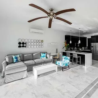 Living Room: The artfully decorated beach-level living room features Carrera marble floors, comfortable furniture, and a 40” Google TV with web capabilities. You’ll love sinking in here at the end of a long day of exploring Provo.