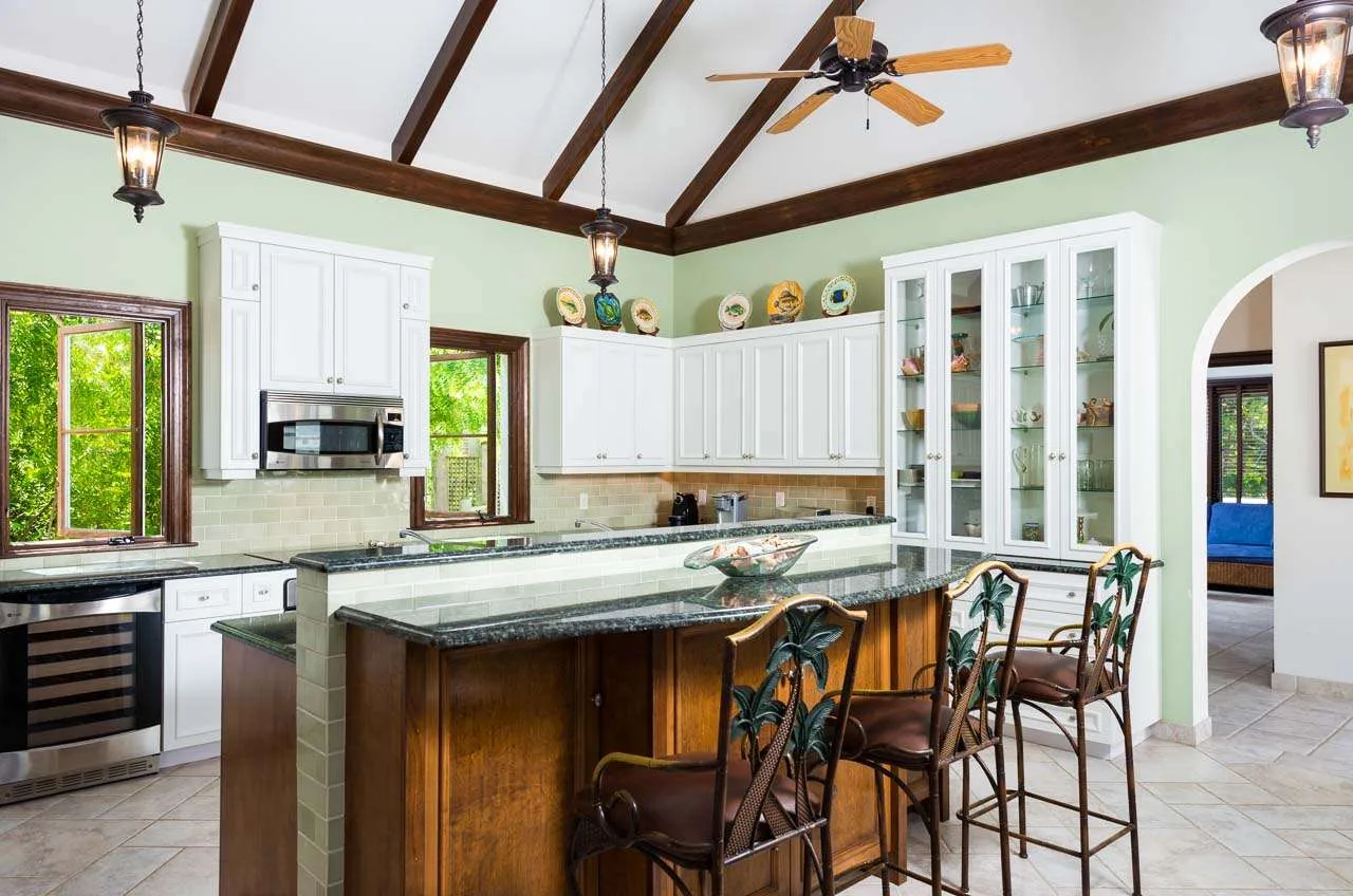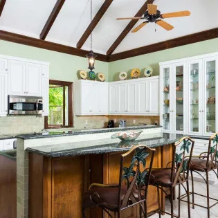 The modern kitchen at Villa Casa Barana comes with chef-caliber appliances that make cooking a breeze. Pastel green walls, with white cabinetry bringing out the wooden tones. The pre-arrival concierge team can even organize a grocery delivery, catered meal, or a private chef for special occasions.