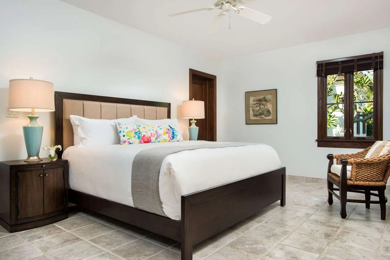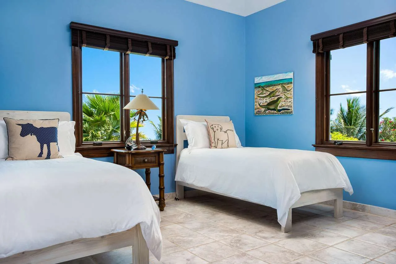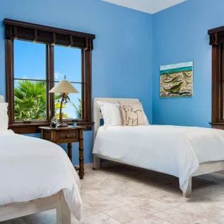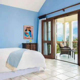 Upstairs, the spacious master suite offers a bar, refrigerator, and a furnished patio with ocean views. An attached nursery is fantastic for those travelers with a newborn baby. Next to the master is the final bedroom, with a pair of twin beds that’s ideal for children. These bedrooms share a large bathroom.