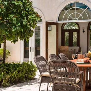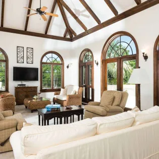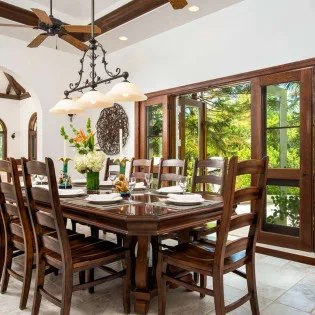 The large open-plan great room is inside the main house, with a spacious living room, dining area, and kitchen. Arched doors and windows enhance the Mediterranean vibe, with elegant, vaulted ceilings above. It’s a fantastic gathering spot for your stay, encouraging you to relax and spend quality time with family and friends.