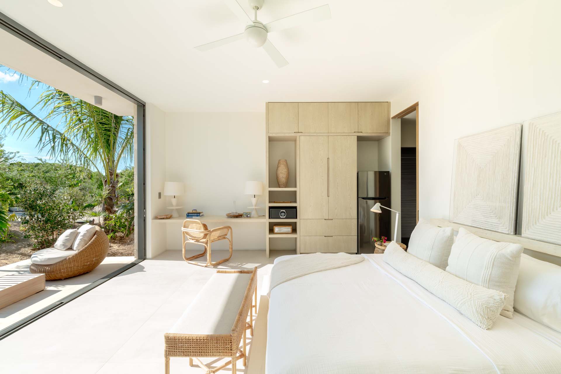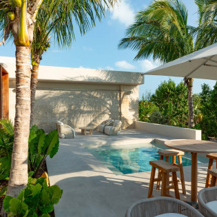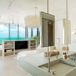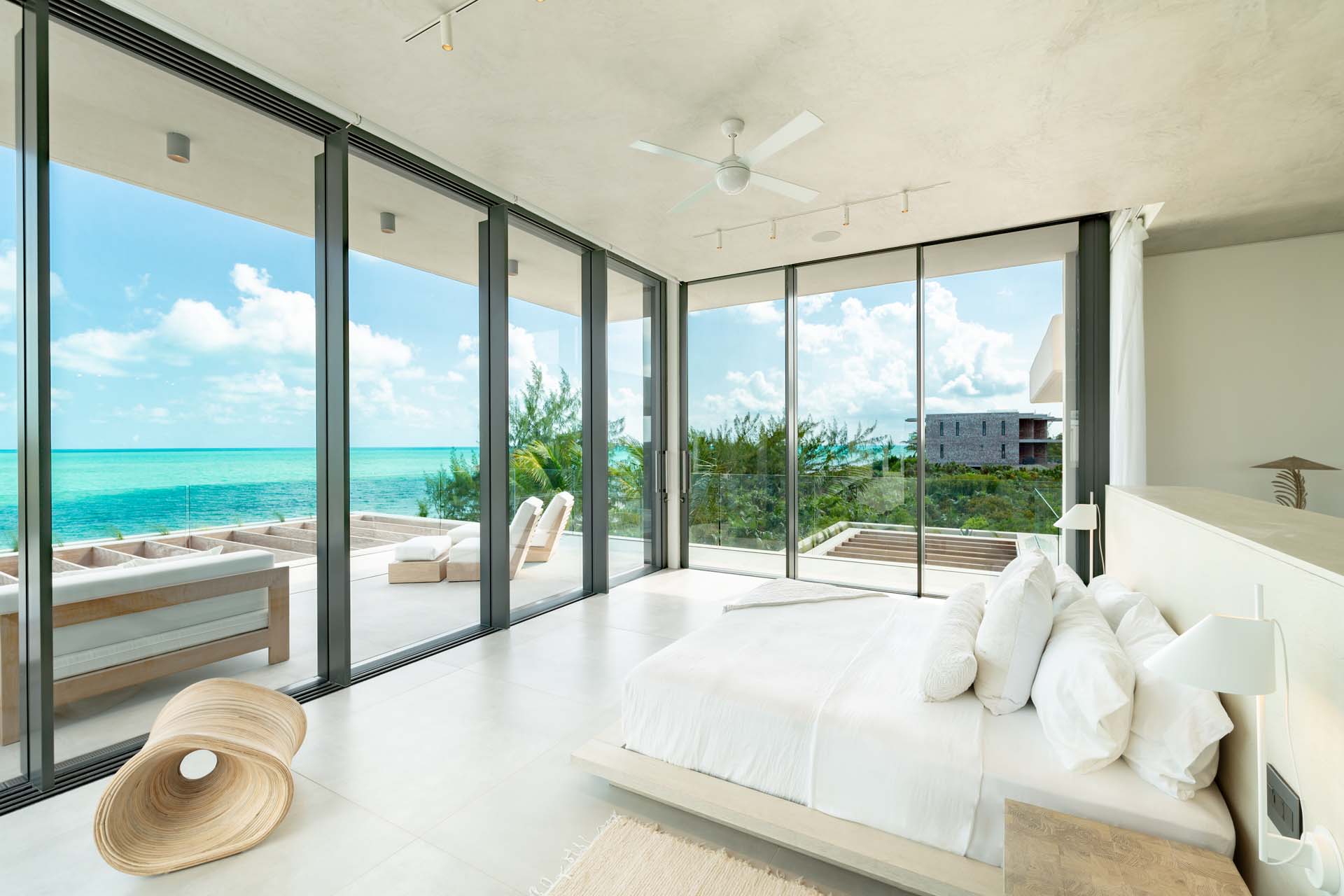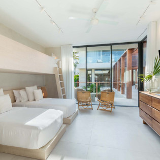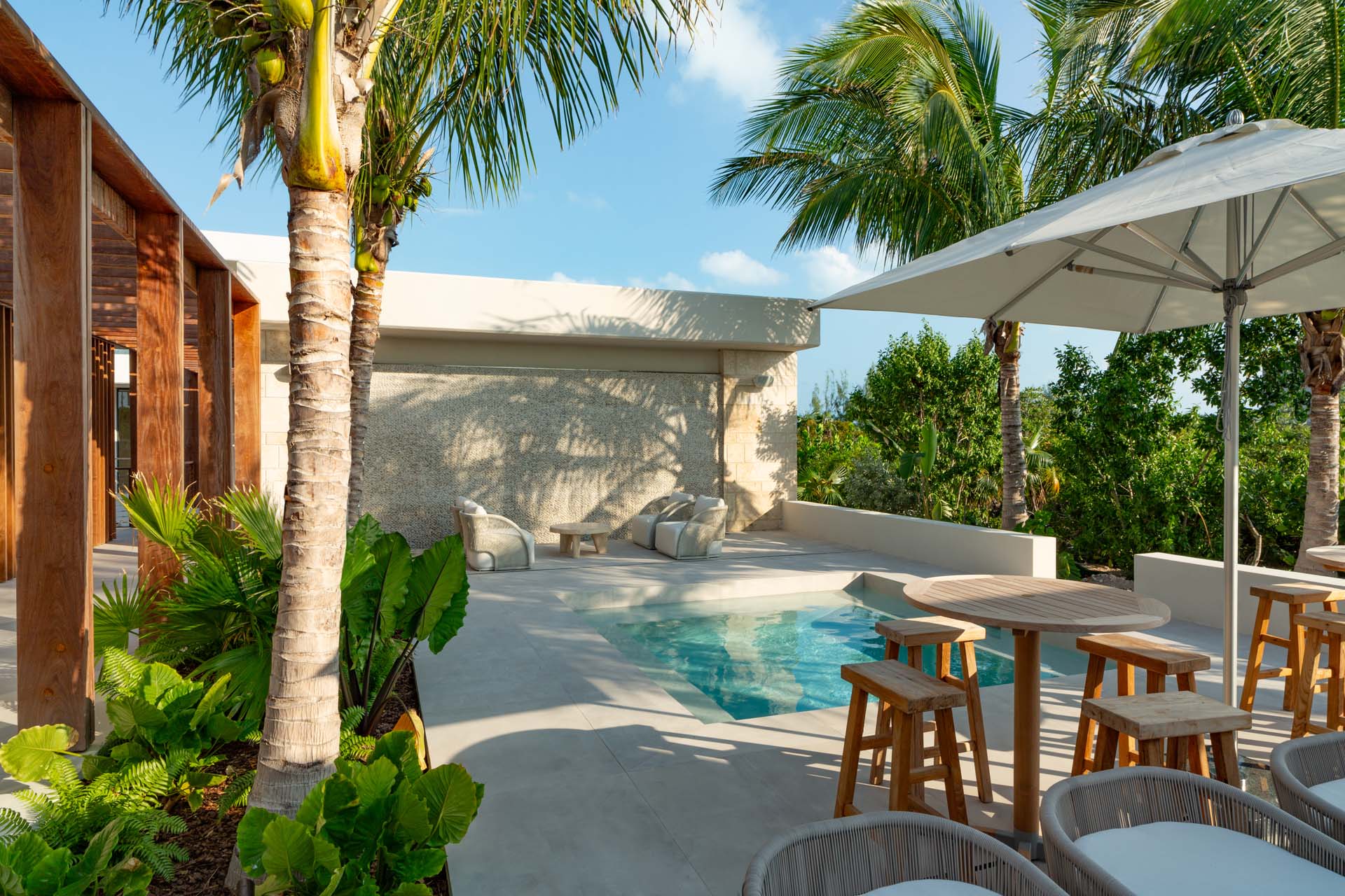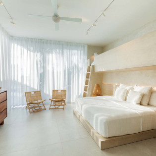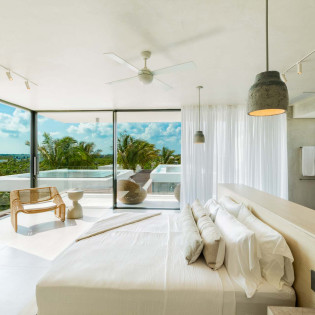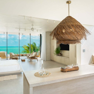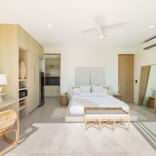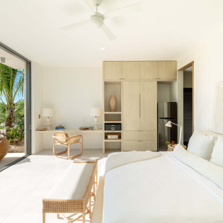 Each bedroom has been styled for maximum comfort and elegance. Whether you’re seeking solitude, a romantic getaway, or a family-friendly space, every room serves as a serene escape. On the upper floor of the main residence, you’ll find three bedrooms, each featuring private rain showers and serene ambiance—perfect for unwinding after a day in the sun.