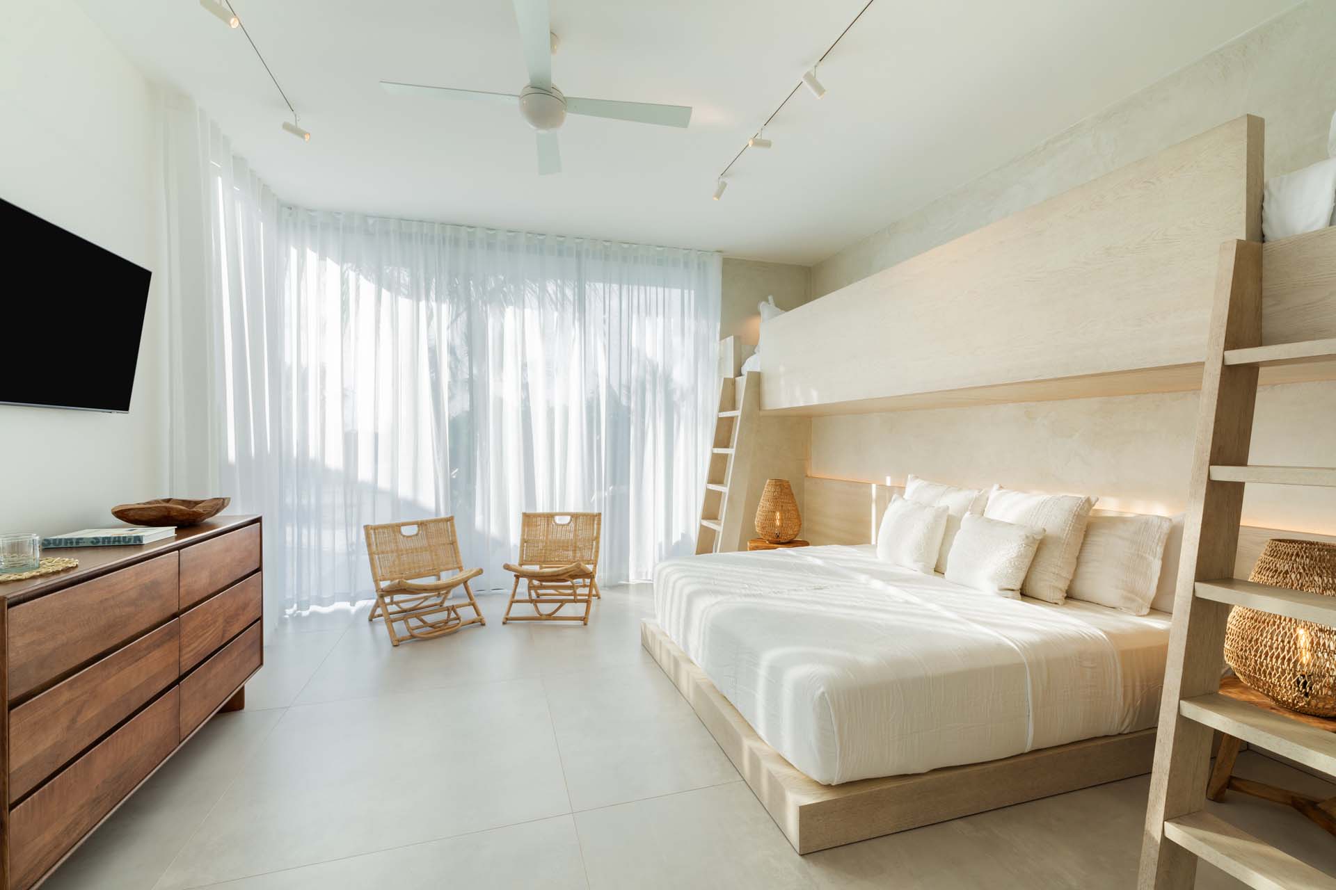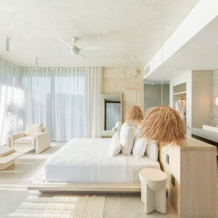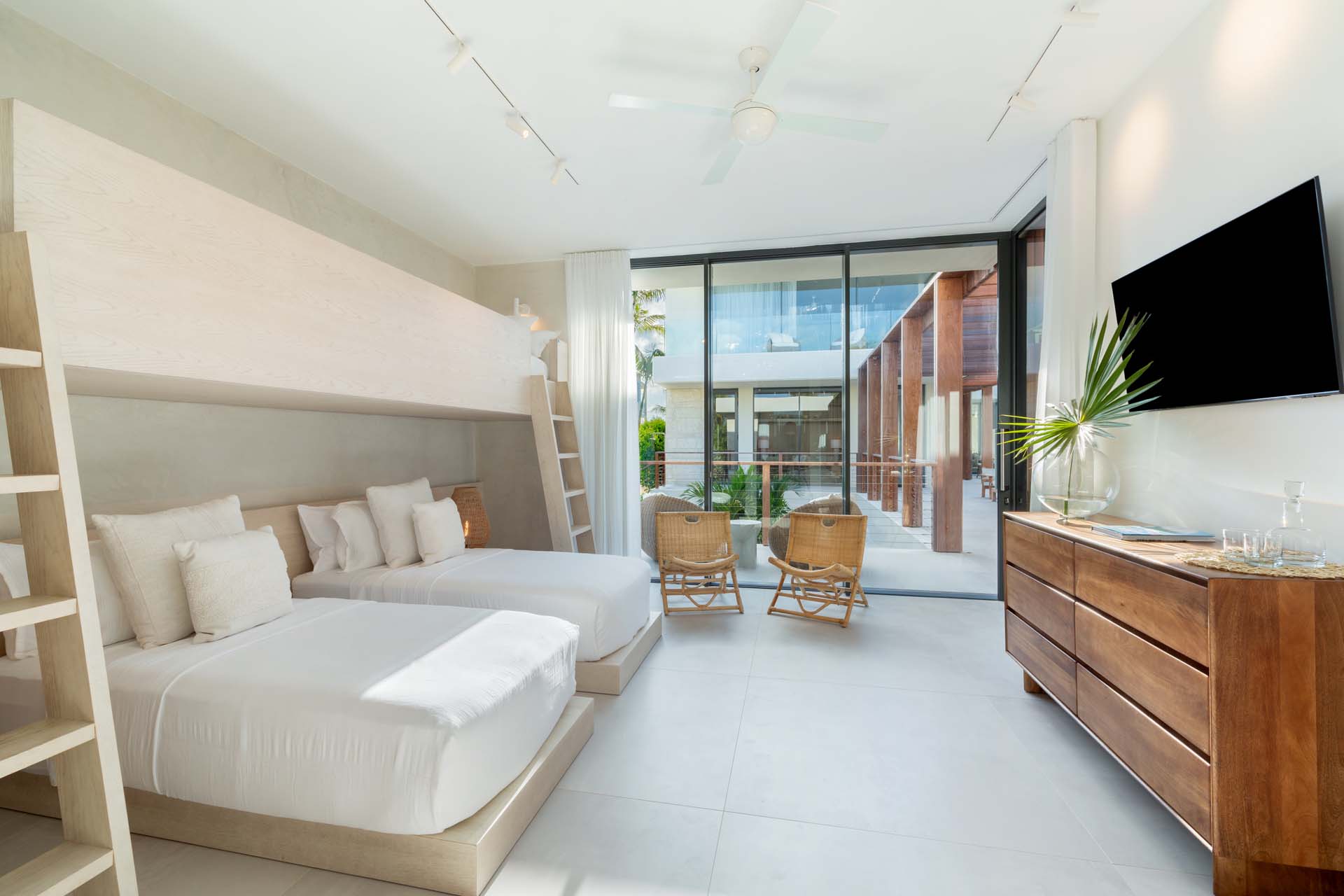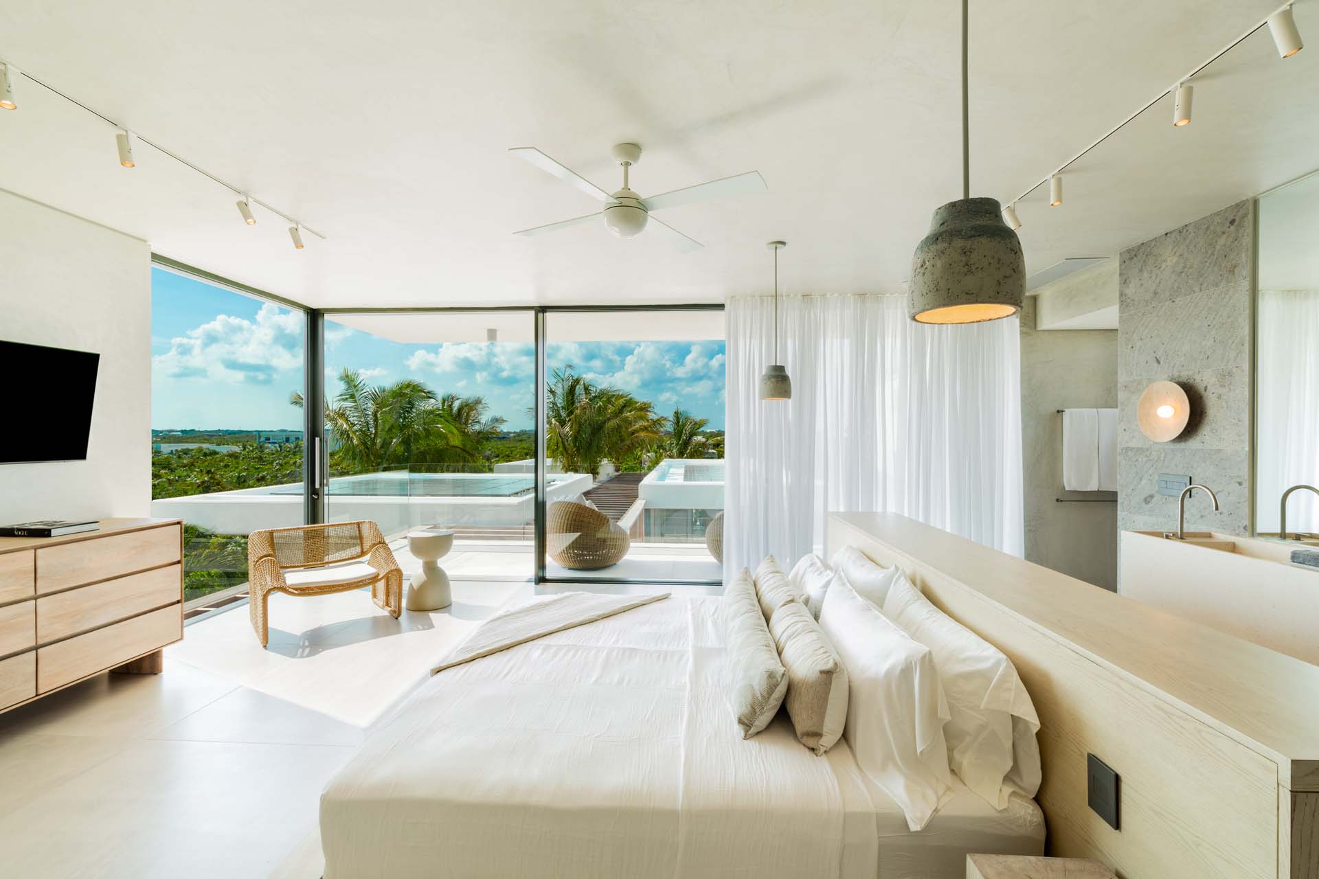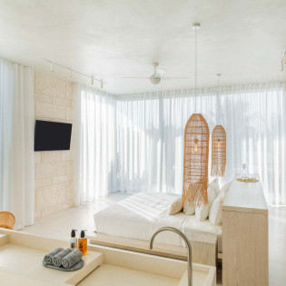 Each bedroom has been styled for maximum comfort and elegance. Whether you’re seeking solitude, a romantic getaway, or a family-friendly space, every room serves as a serene escape. On the upper floor of the main residence, you’ll find three bedrooms, each featuring private rain showers and serene ambiance—perfect for unwinding after a day in the sun.