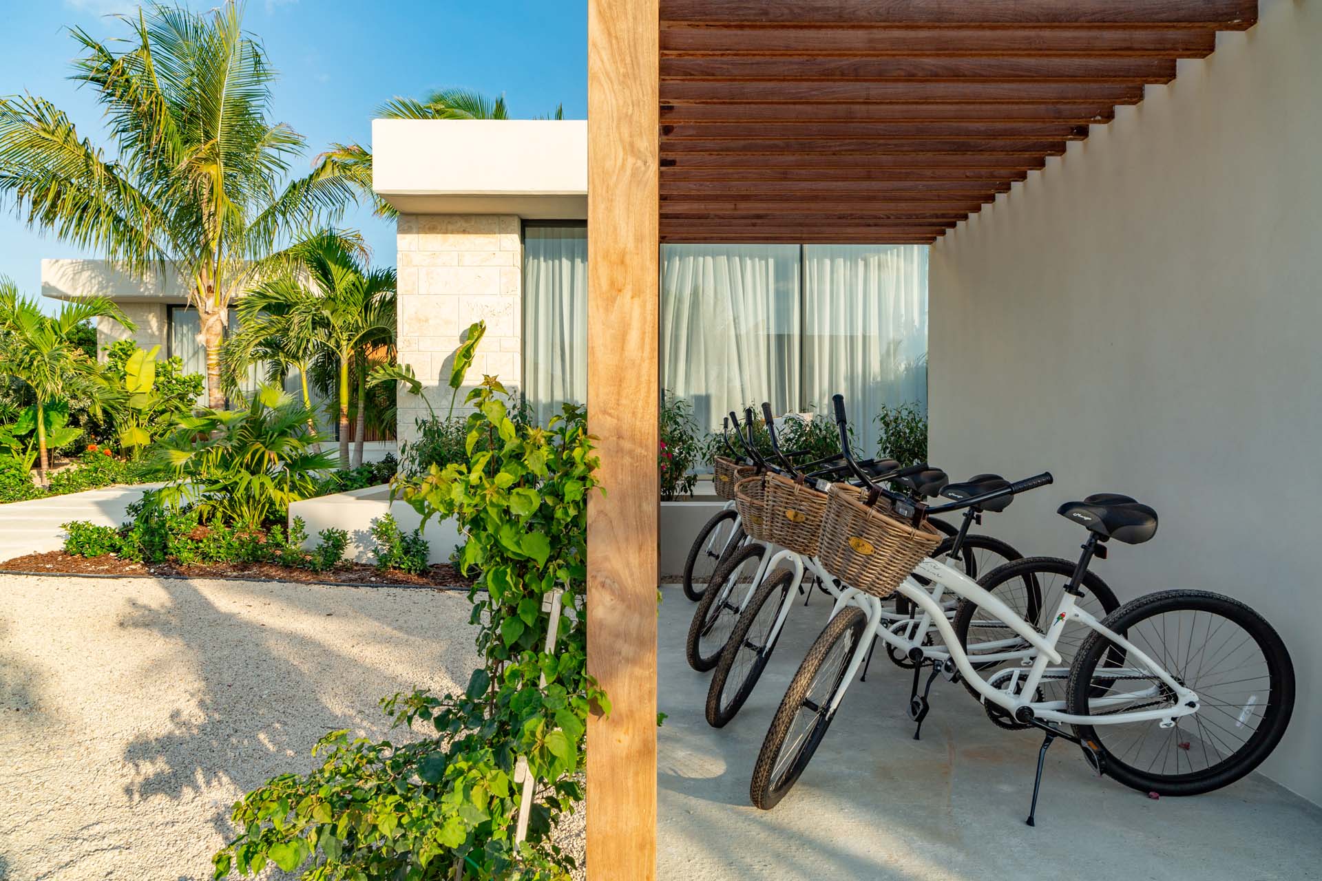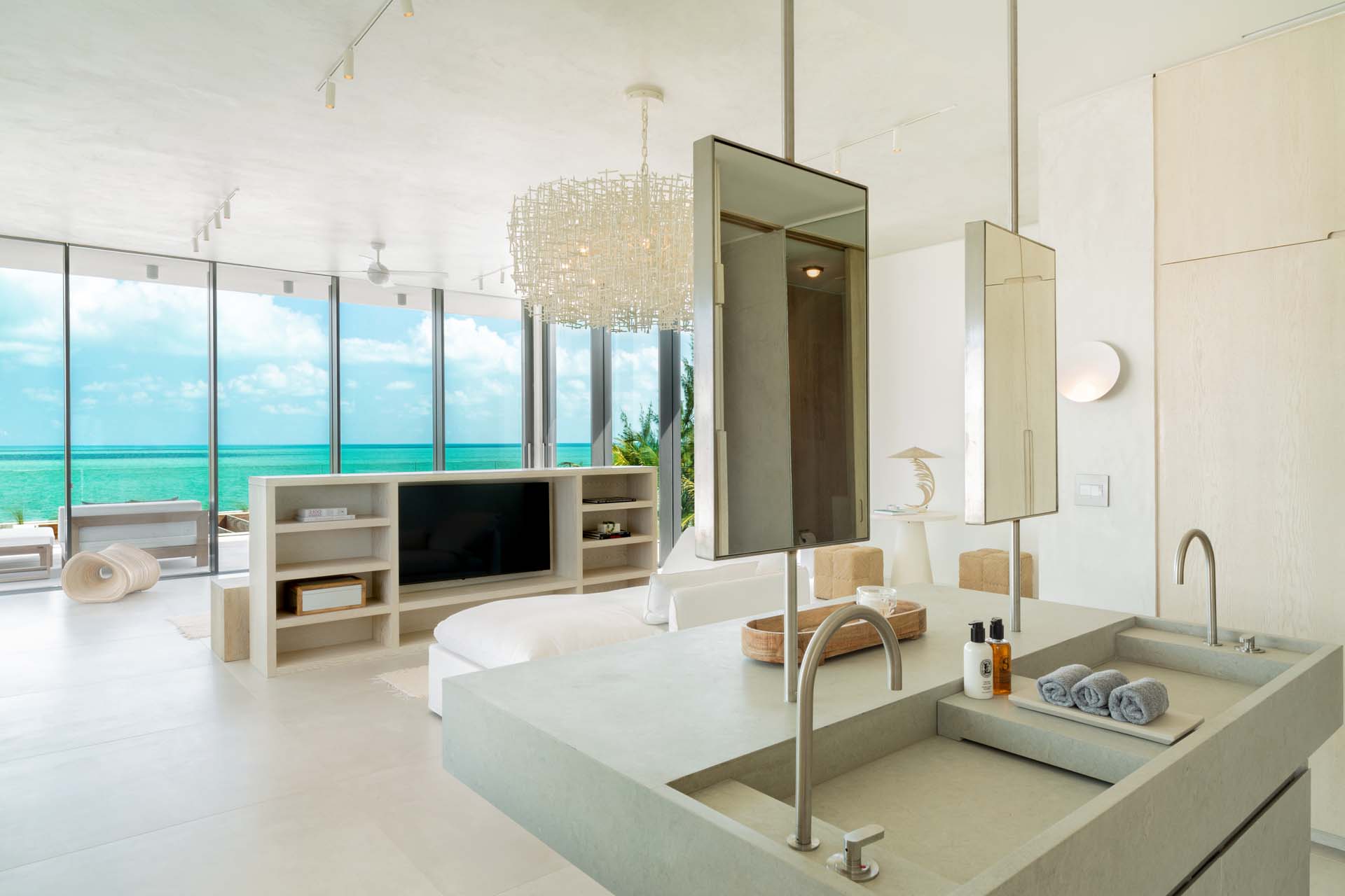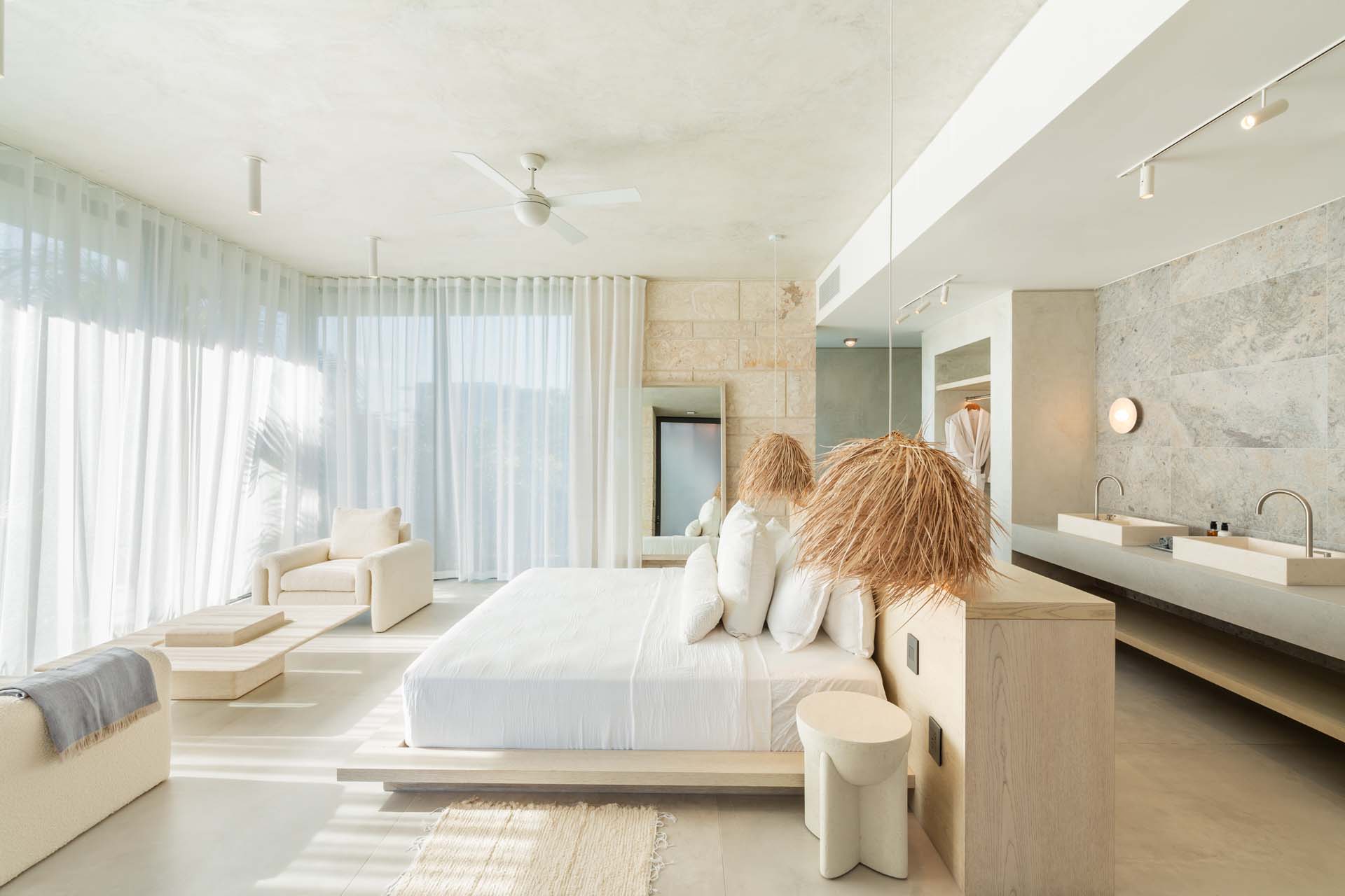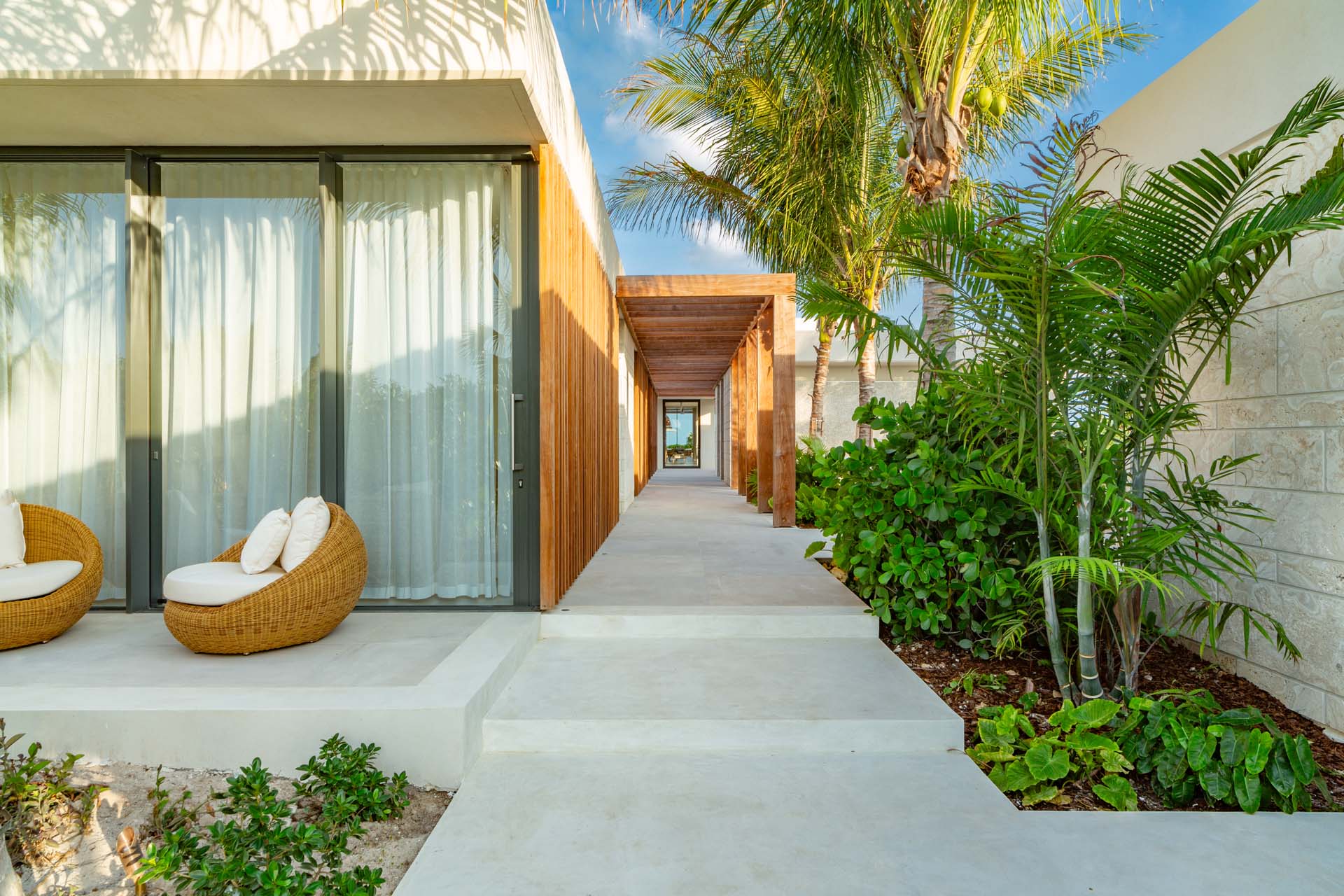Each bedroom has been styled for maximum comfort and elegance. Whether you’re seeking solitude, a romantic getaway, or a family-friendly space, every room serves as a serene escape. On the upper floor of the main residence, you’ll find three bedrooms, each featuring private rain showers and serene ambiance—perfect for unwinding after a day in the sun.
