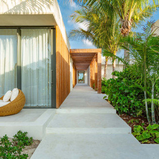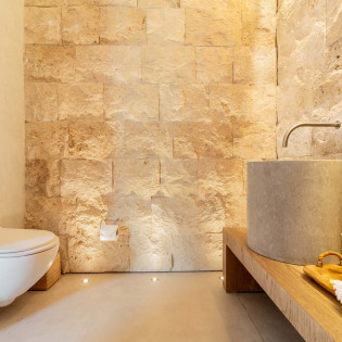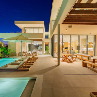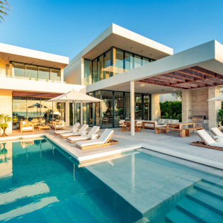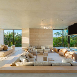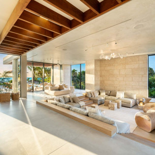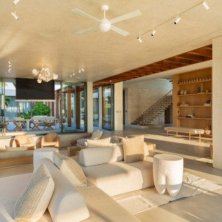 The design of Villa Dune House blends seamlessly with its natural environment, featuring native stone and locally sourced wood that lend a sense of warmth and texture to its modern architecture.