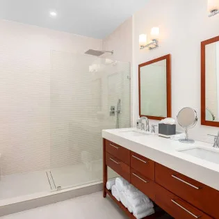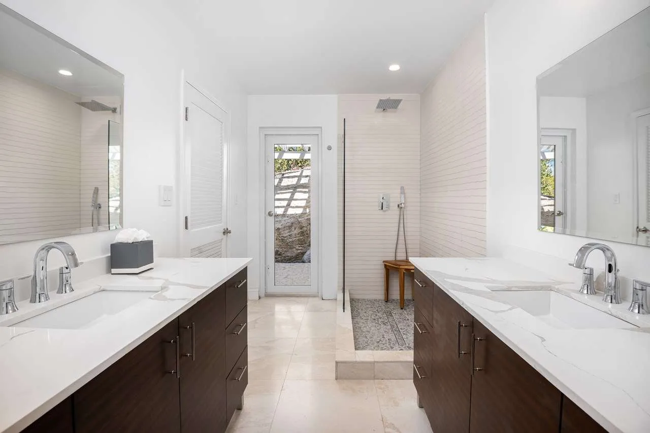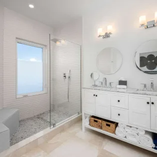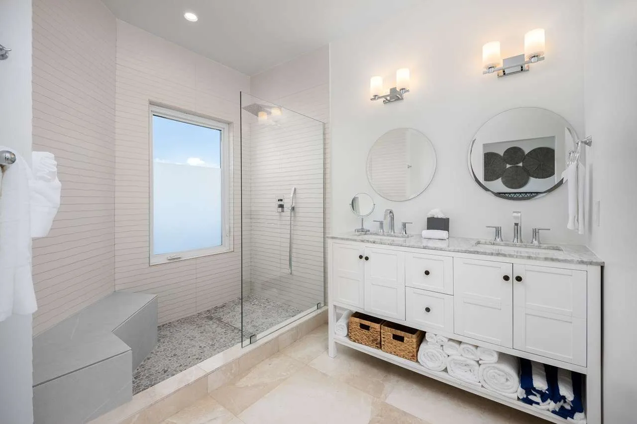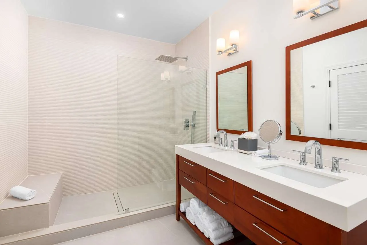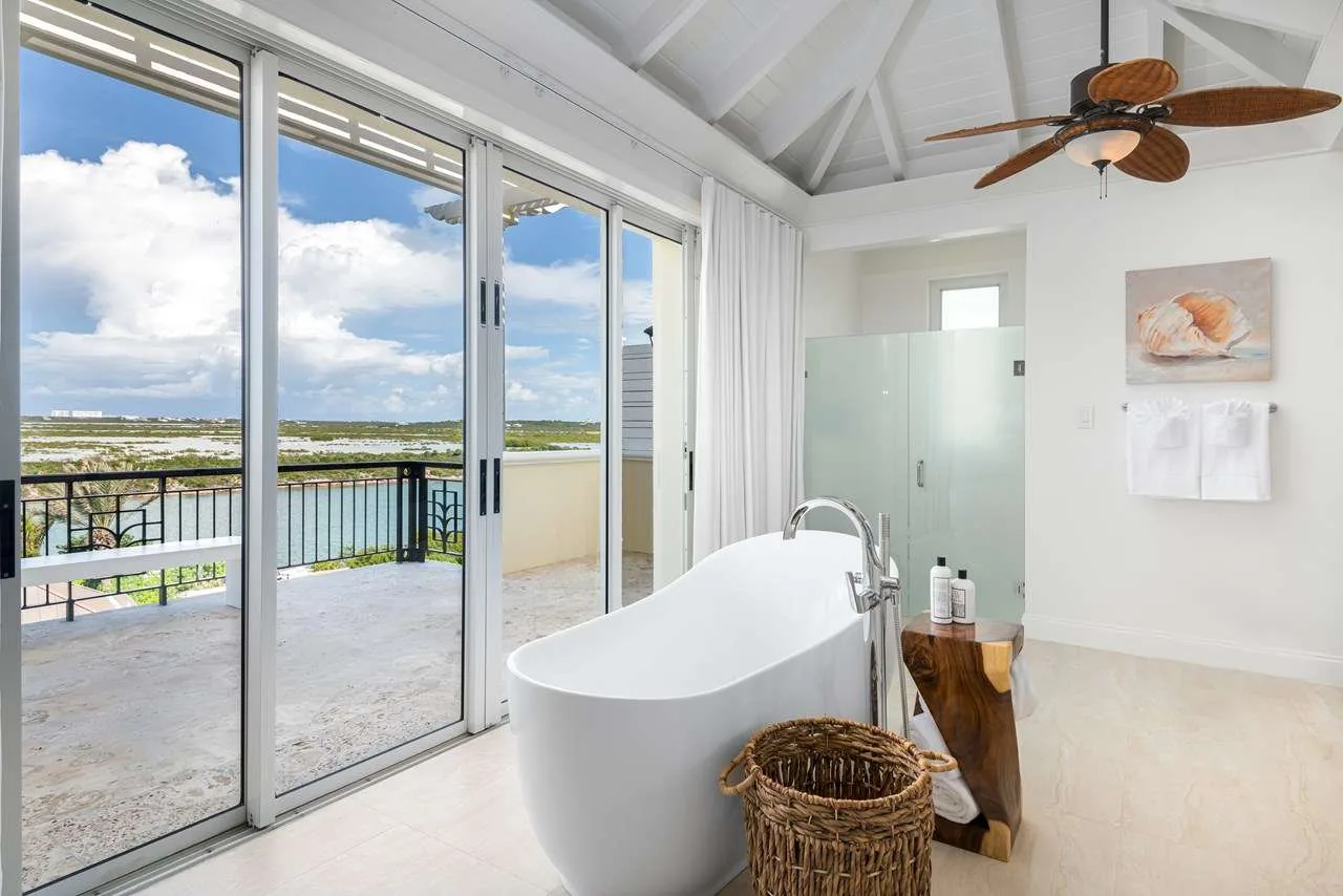 Three of the bedrooms in Emara West have ocean views, four have marina views, and two do not have a water view. There are 18 bathrooms, 15 ensuite and 3 shared.