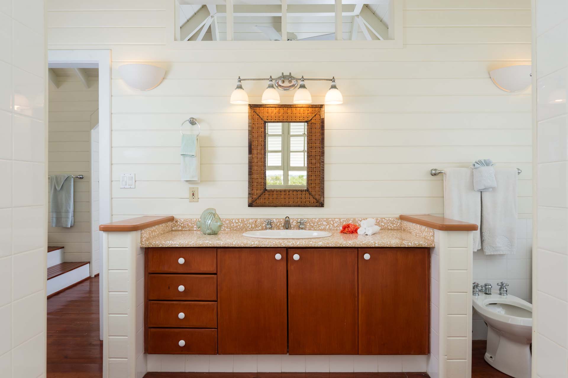 The island spirit continues in Villa Etoile de Mer’s kitchen, with blue splashbacks mirroring the water outside. You’ll easily be able to create gourmet feasts here, with high-end appliances and plenty of space. Our pre-arrival concierge can organize a pre-stock. A formal dining table has space for up to 8 guests, making it an ideal spot for lively dinners, a game night, or just some conversation and drinks. As you sit here, you’ll be able to hear the gentle rustle of the waves washing over the beach.