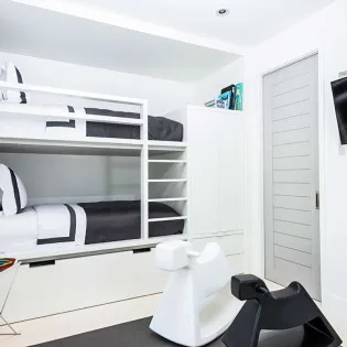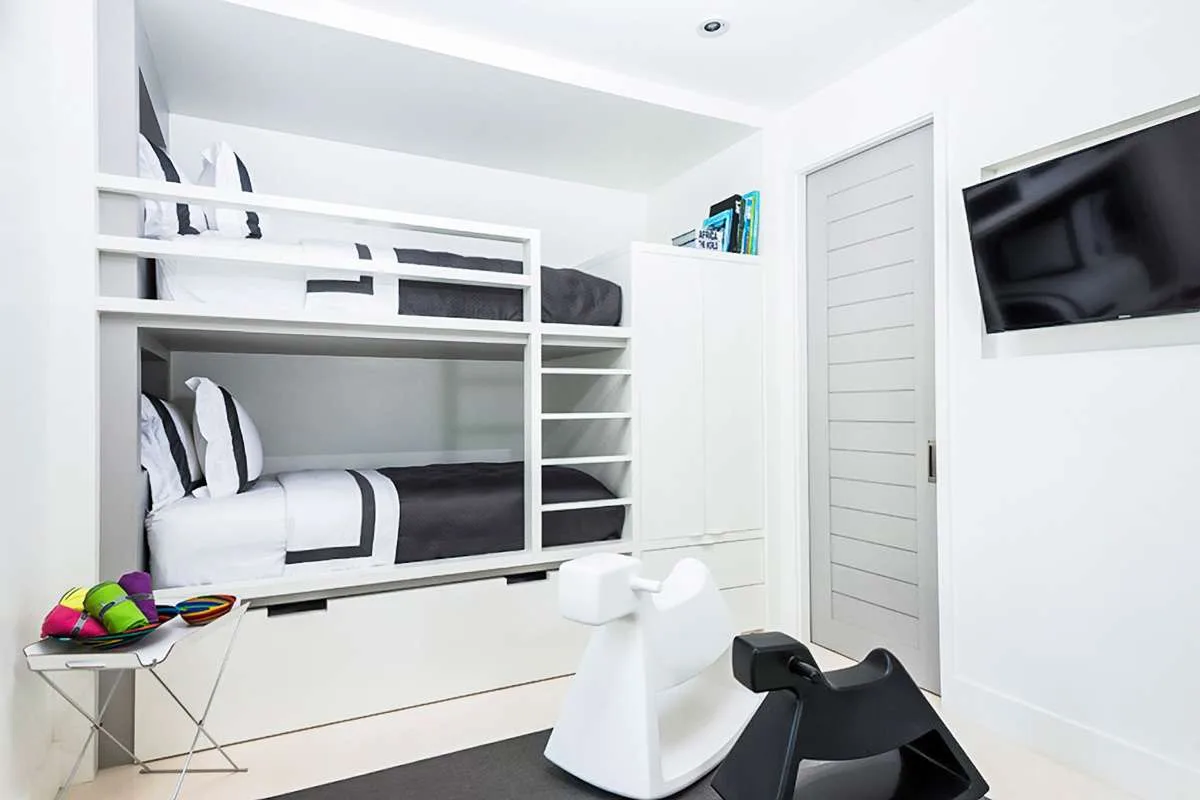 Villa Awa features 6 ensuite bedrooms. The master bedroom on the first floor features a king-size bed, indoor and outdoor showers, a pop-up TV, and a terrace with ocean views. A second bedroom on the ground floor features comfy bunk beds.