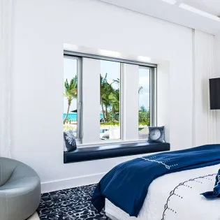 The main living space is engaging, with thoughtful marble details, fascinating artwork, and unique wallpapers helping to bring the vibrant Caribbean colors inside.