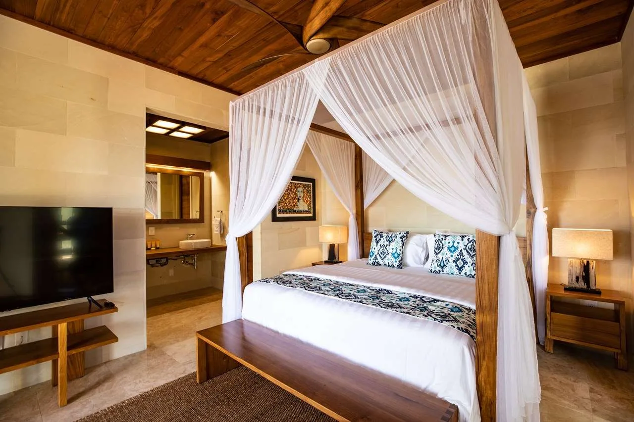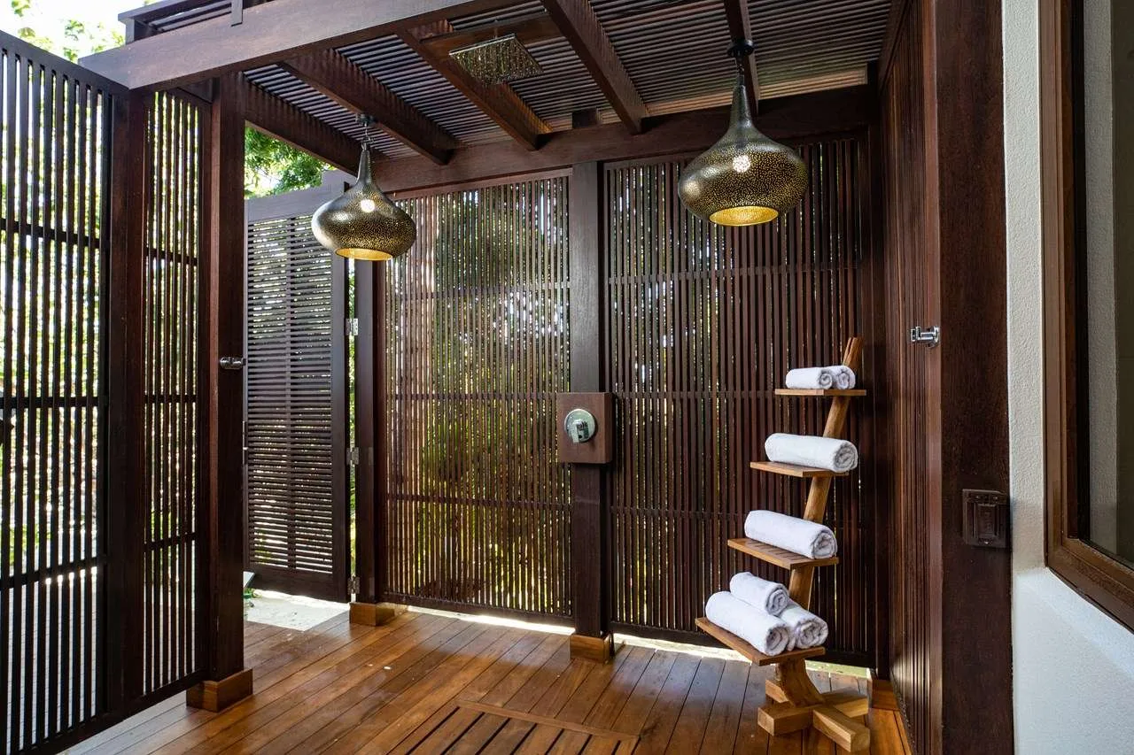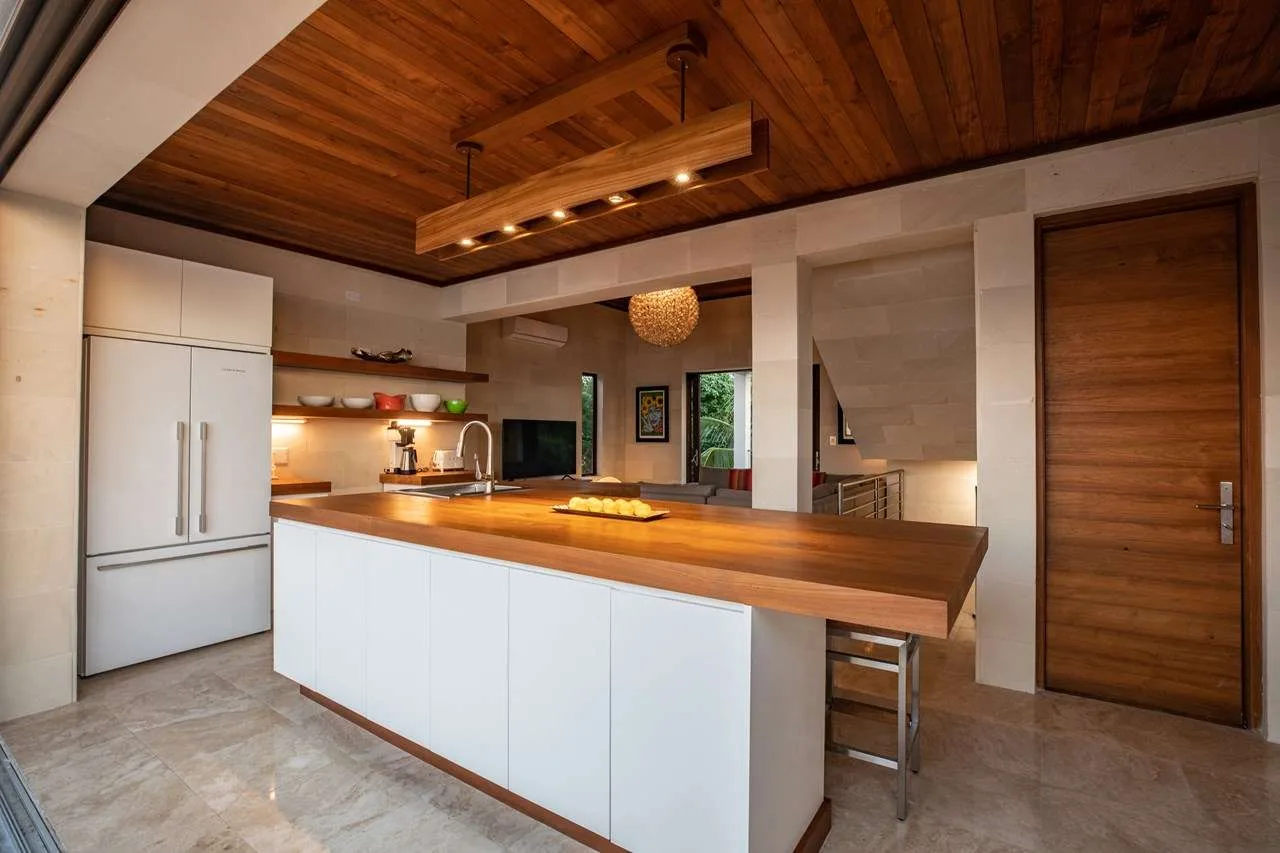 The cool vibe of the tiled walls, teak ceilings, decorative feature lighting and pop art make this villa one of a kind.