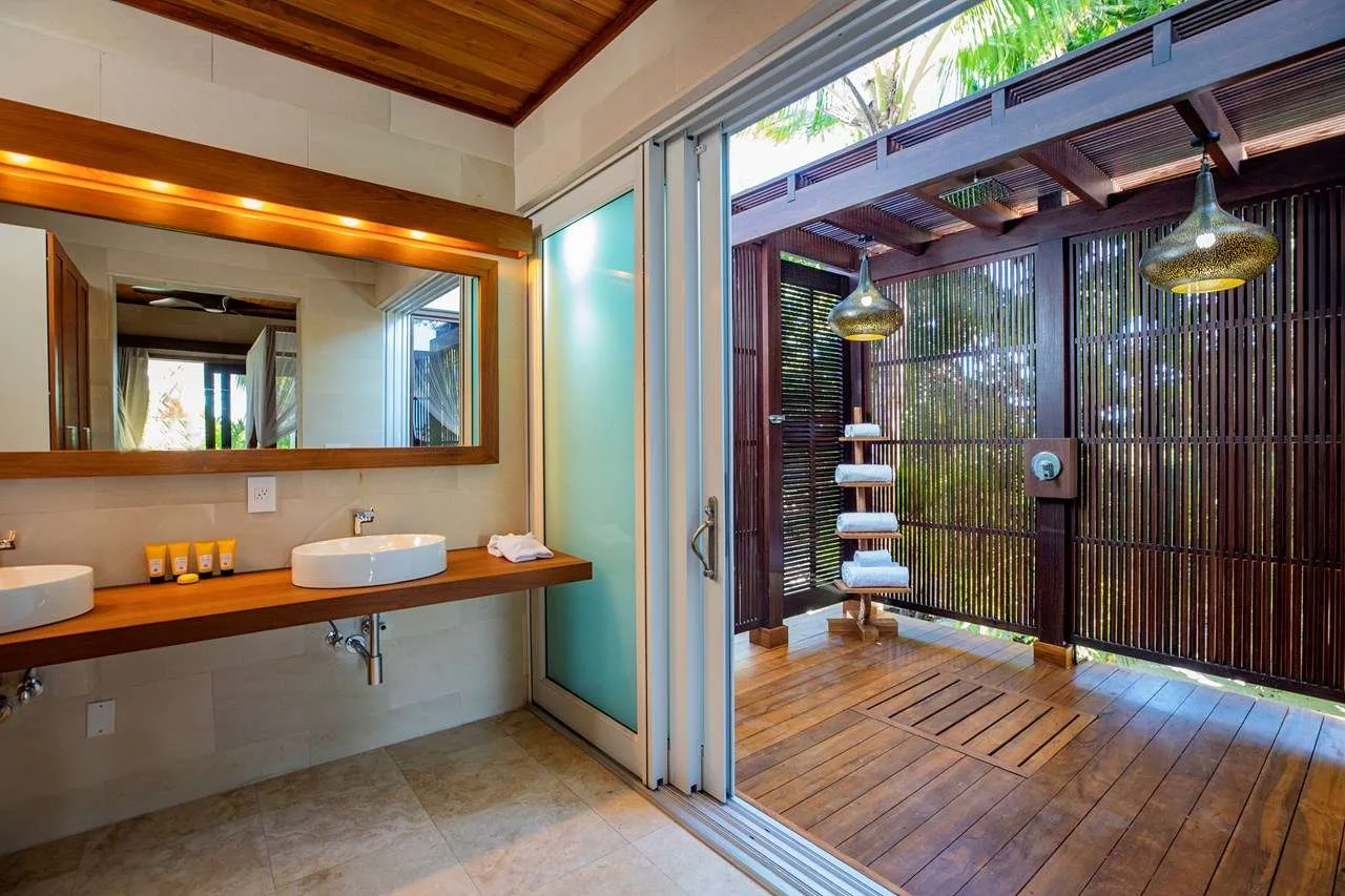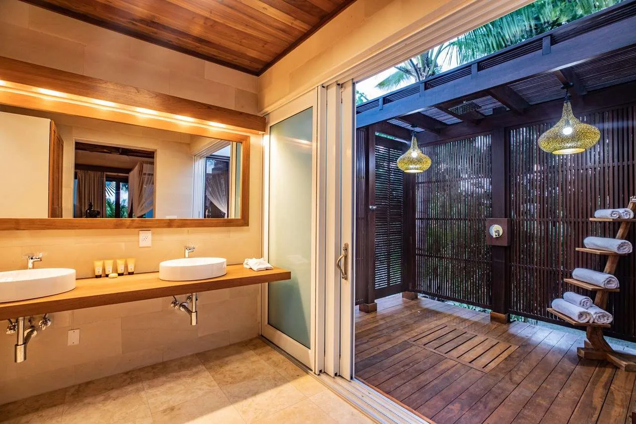 The two bedrooms both have ensuite bathrooms with the showers and bath outside in the main master. There are high end appliances in the kitchen although there are several good restaurants within walking distance.