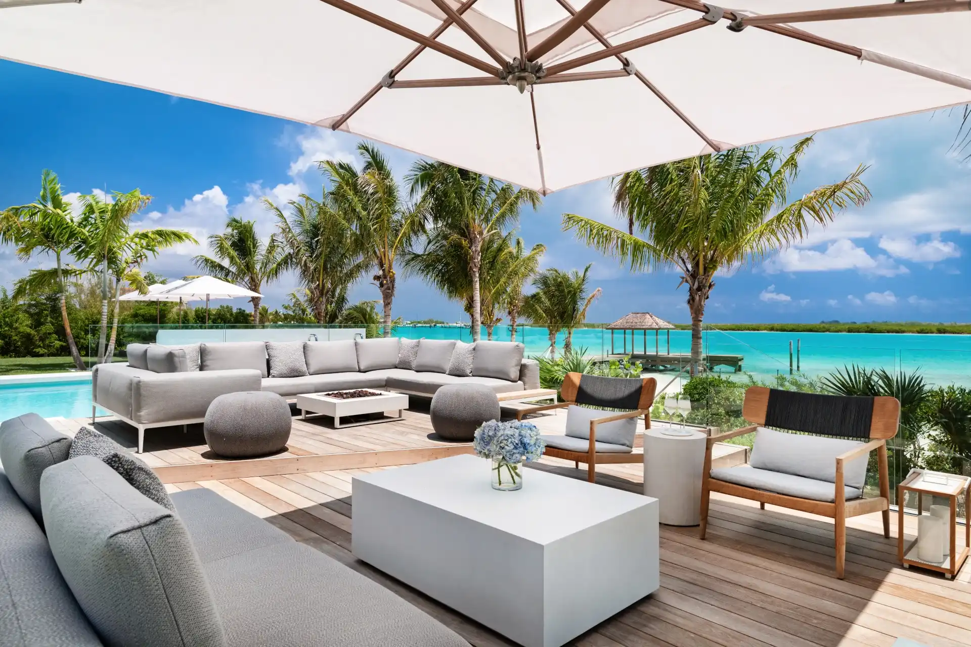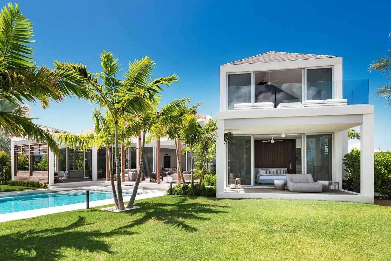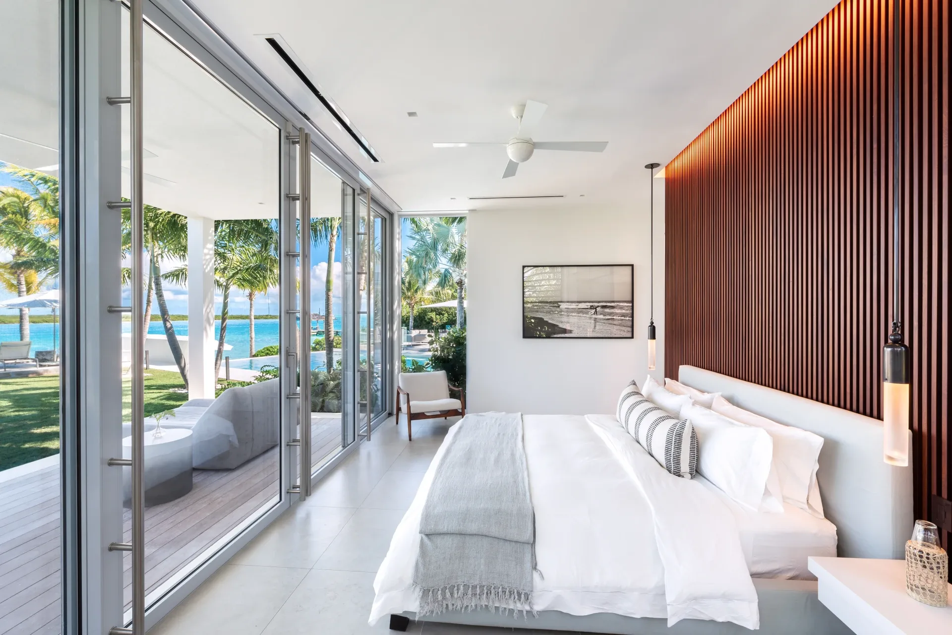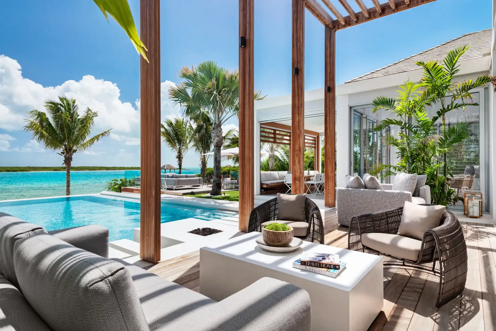 Outside, verdant grass lawns and swaying palm trees frame an infinity edge pool that spills onto a secluded beach replete with private dock.