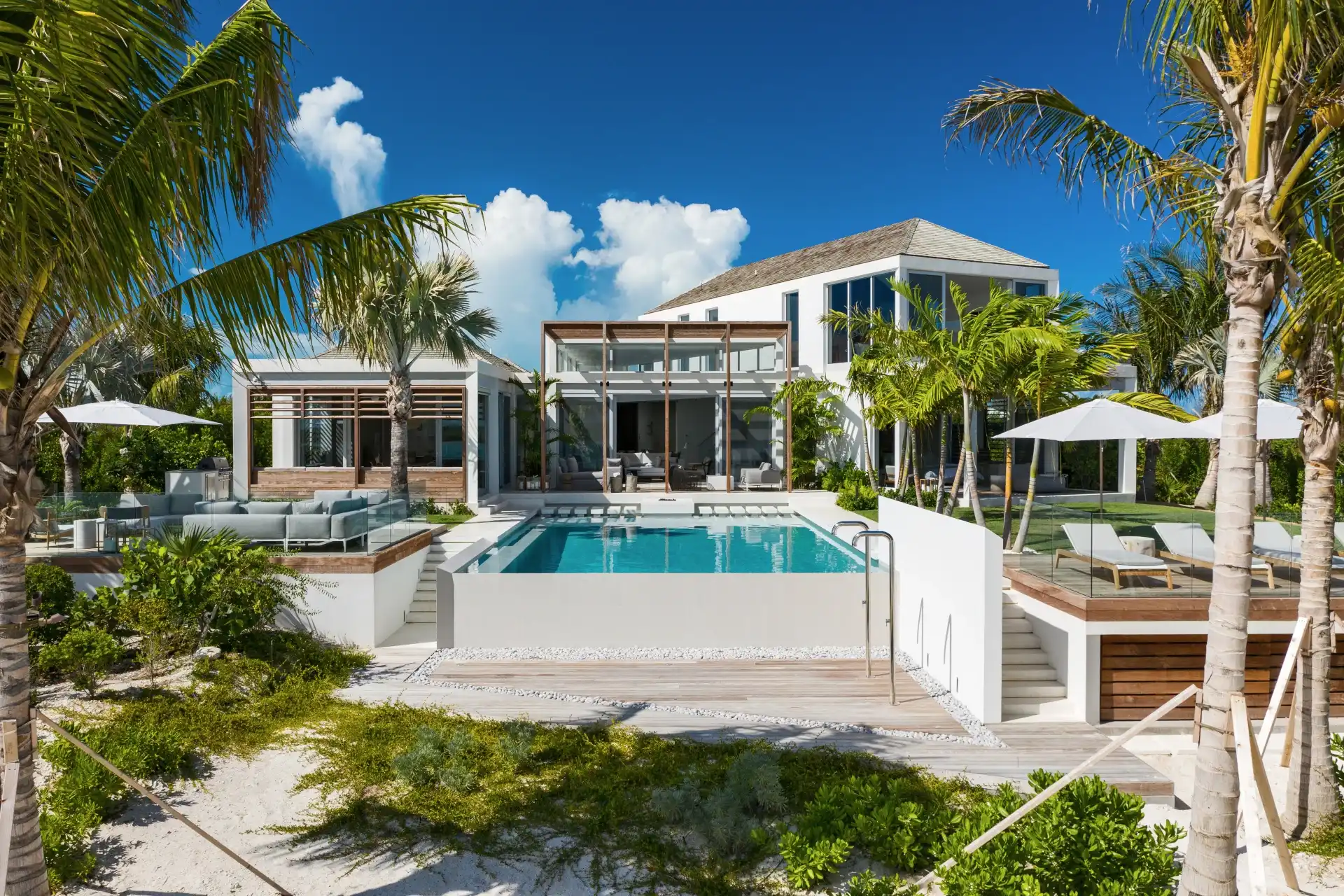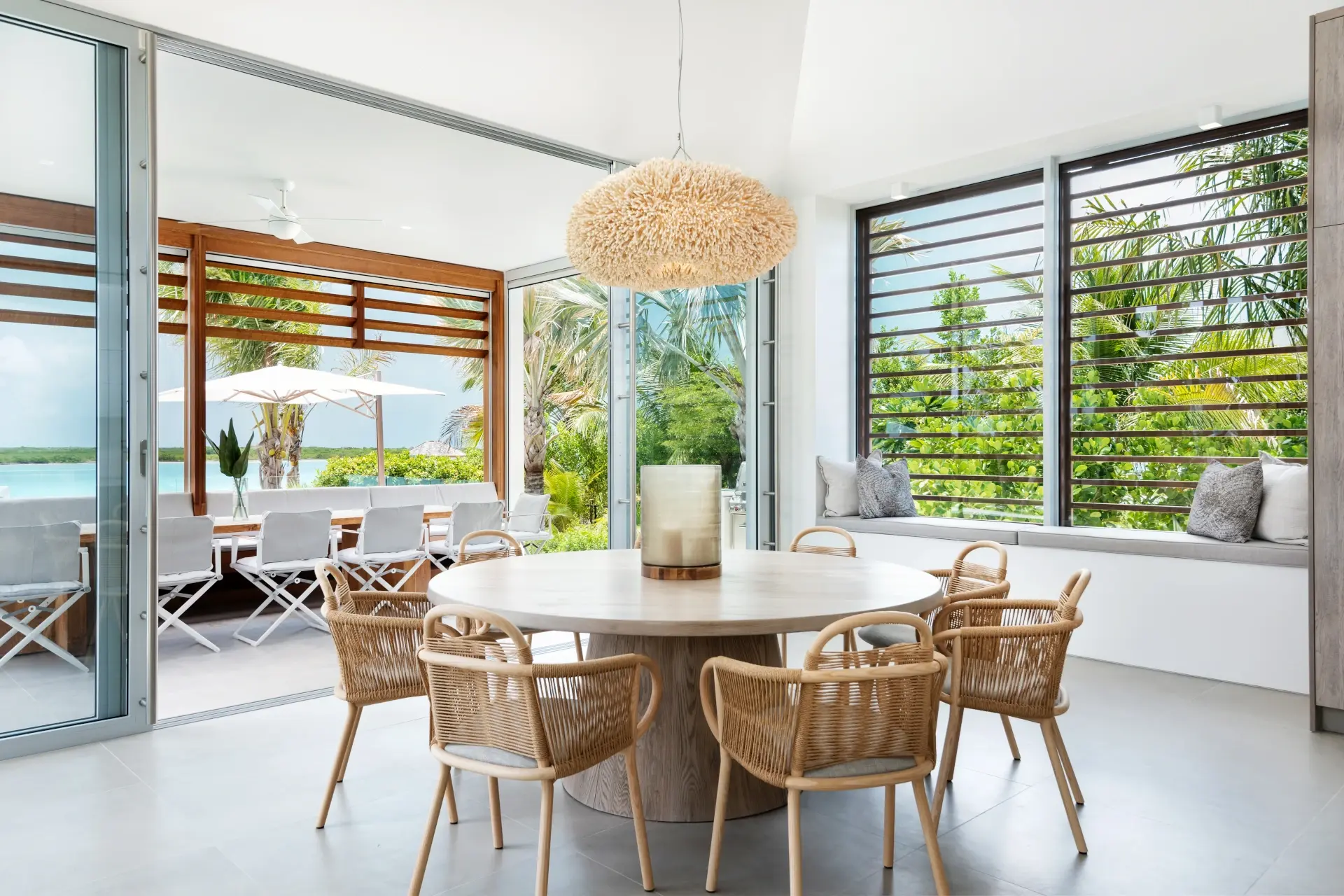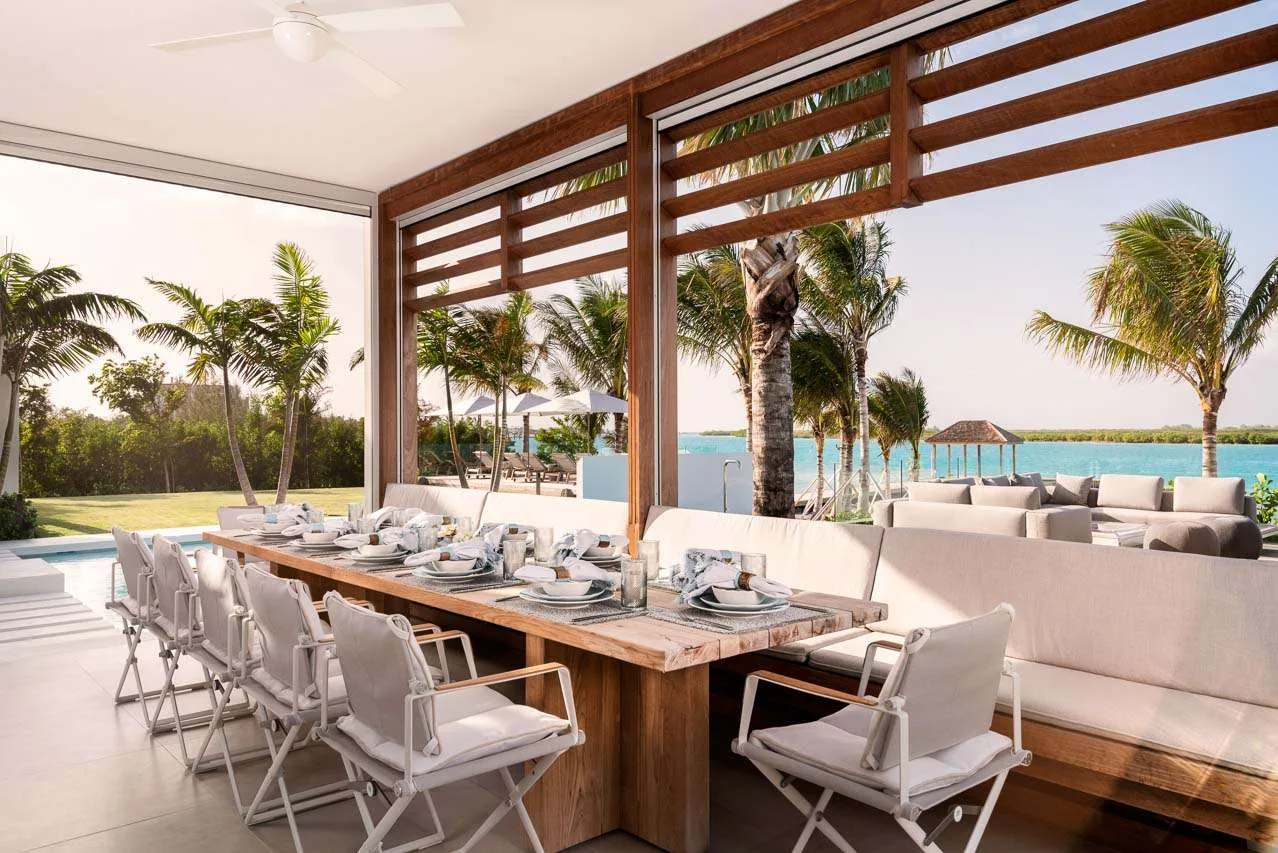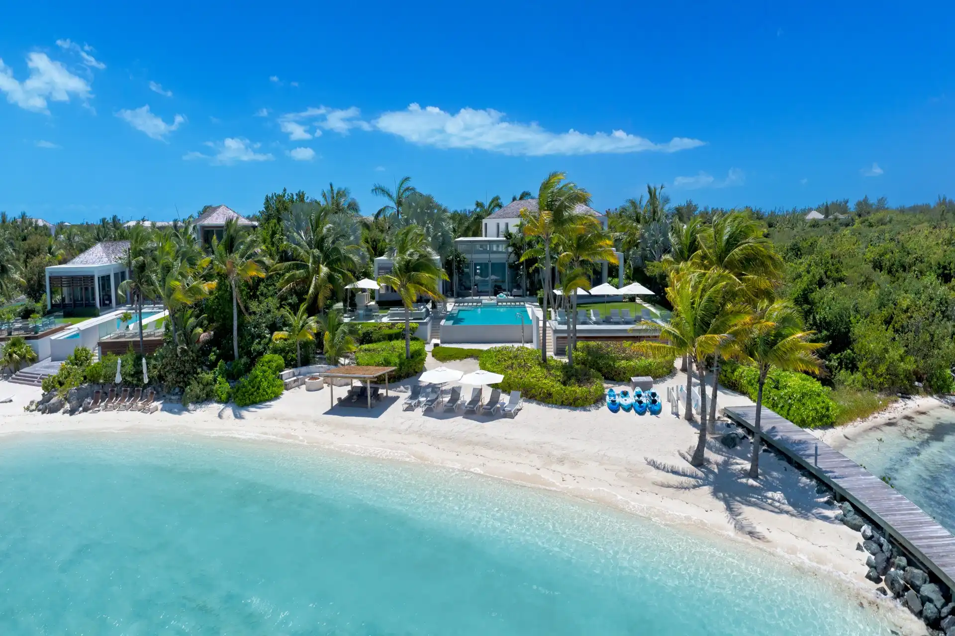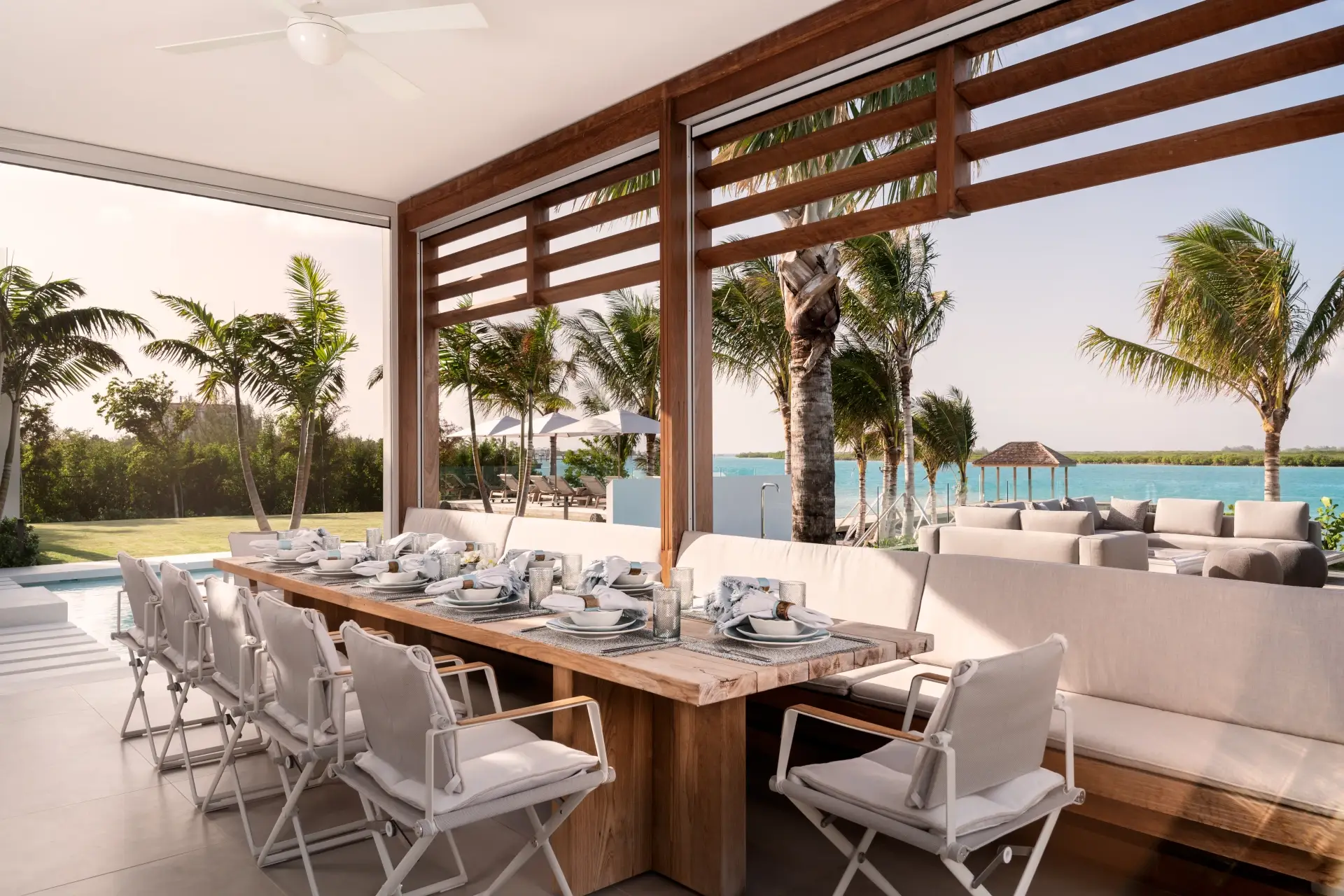 Outside, verdant grass lawns and swaying palm trees frame an infinity edge pool that spills onto a secluded beach replete with private dock.