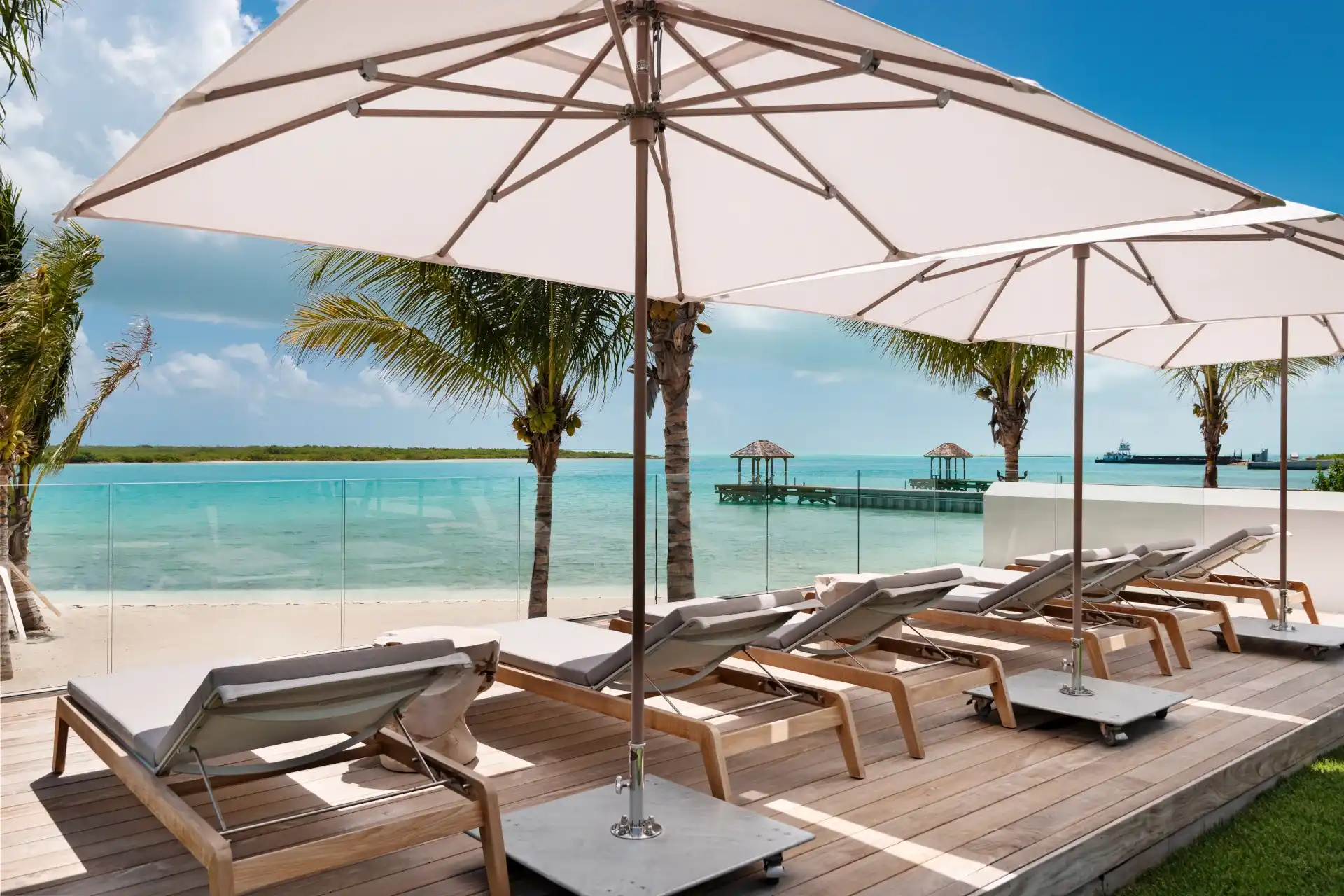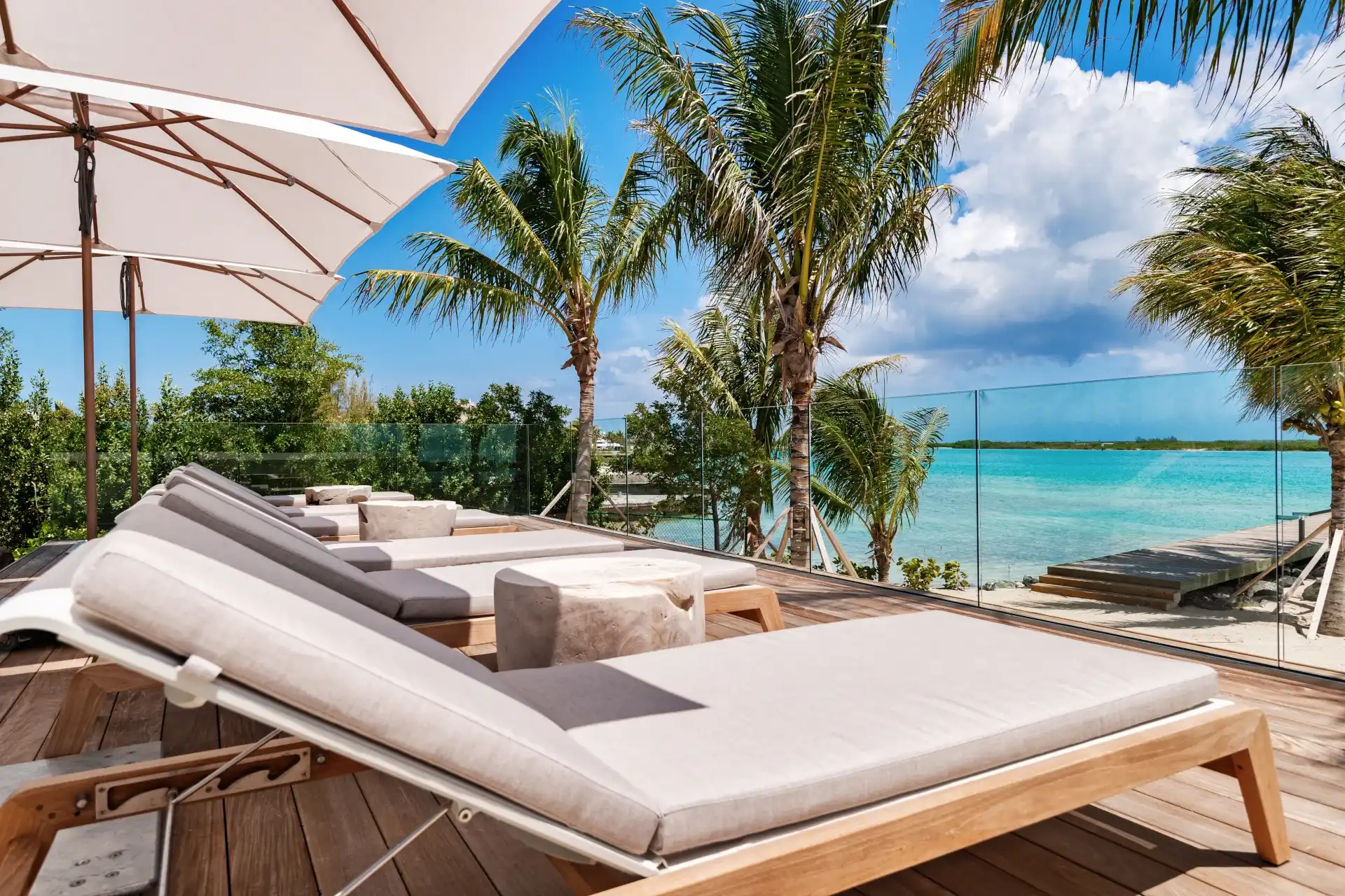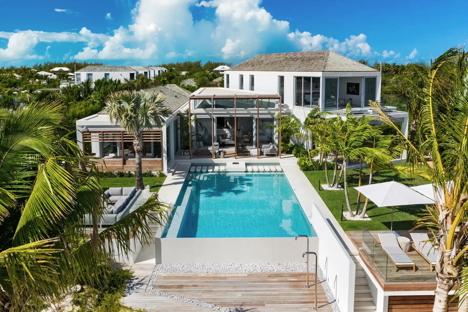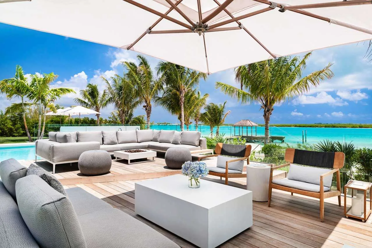 Outside, verdant grass lawns and swaying palm trees frame an infinity edge pool that spills onto a secluded beach replete with private dock.