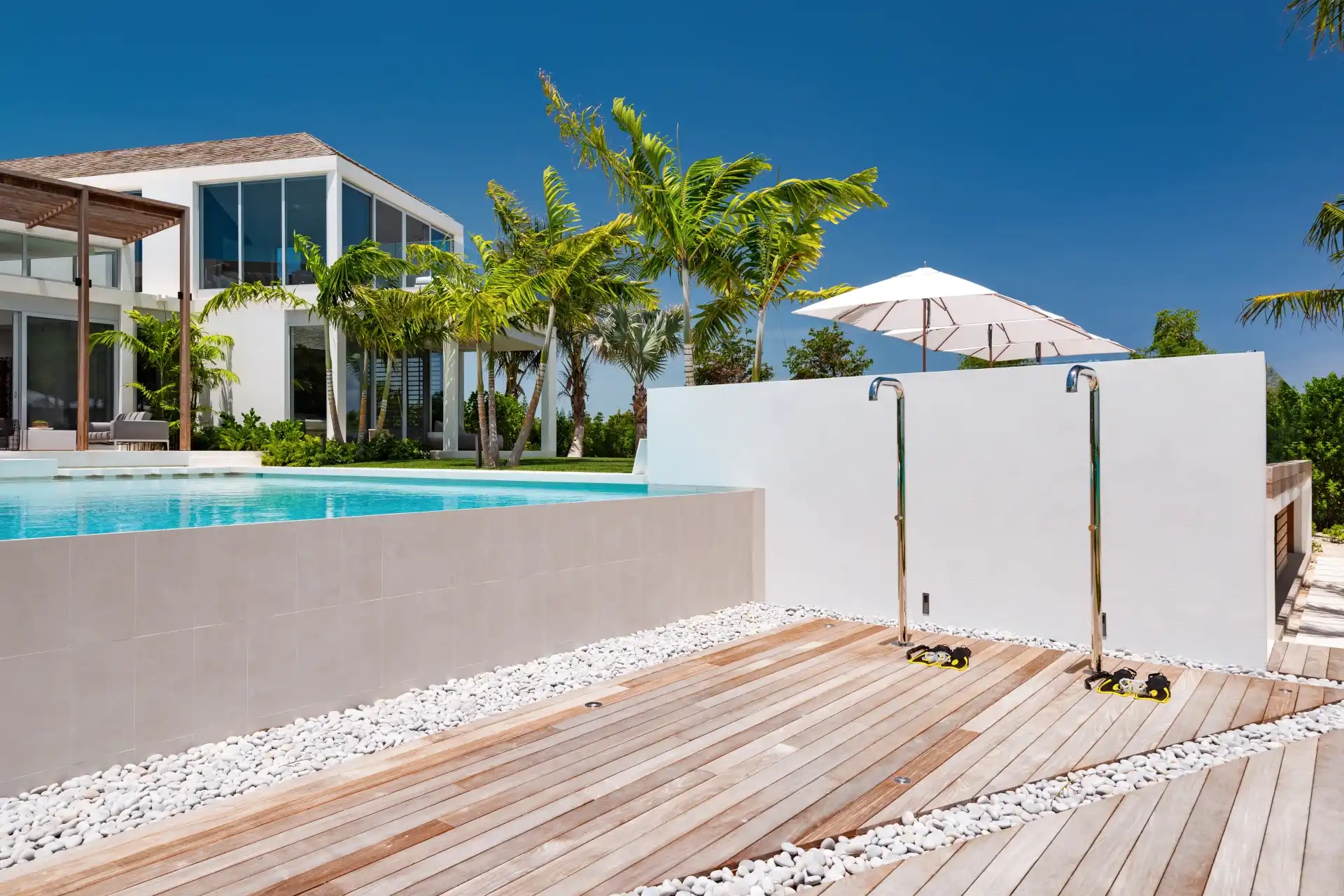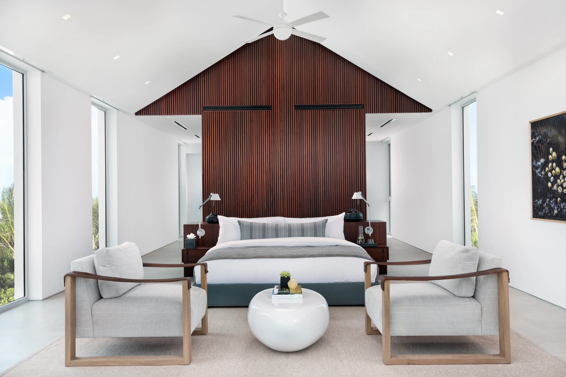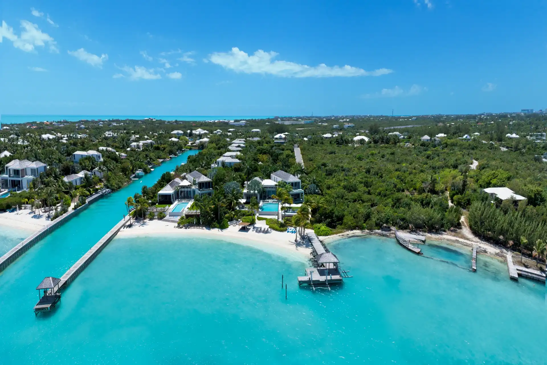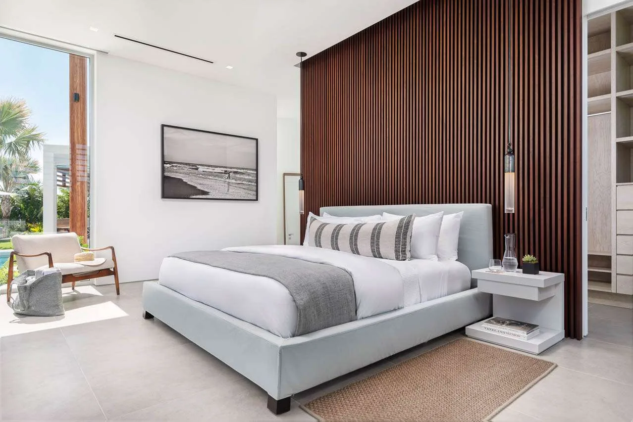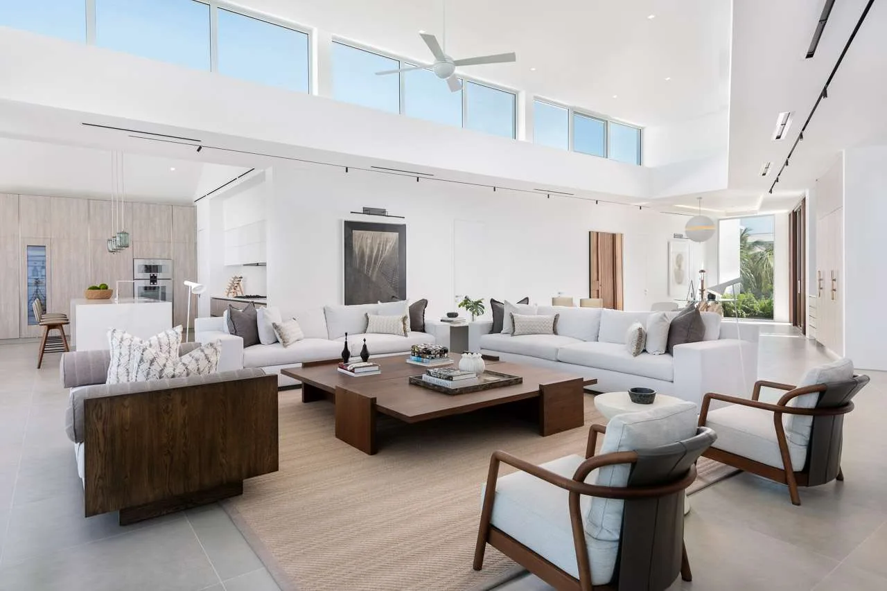 Outside, verdant grass lawns and swaying palm trees frame an infinity edge pool that spills onto a secluded beach replete with private dock.